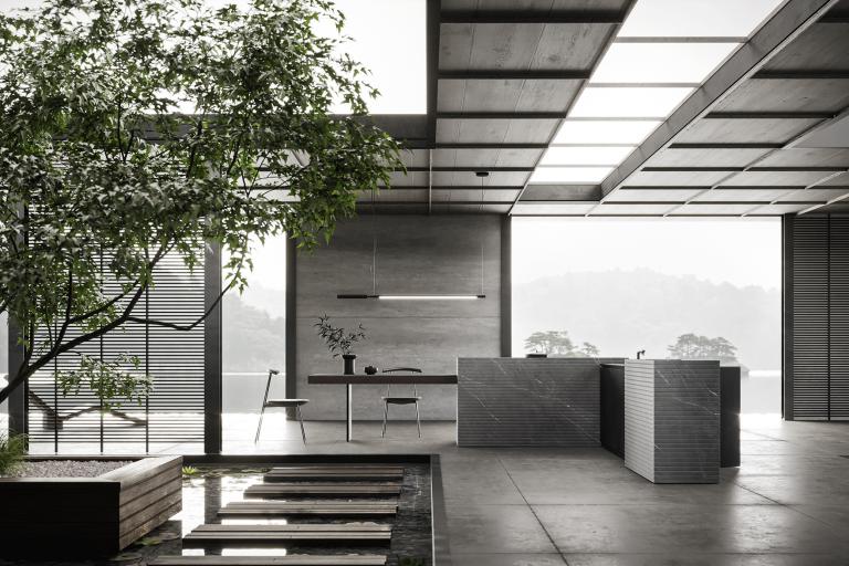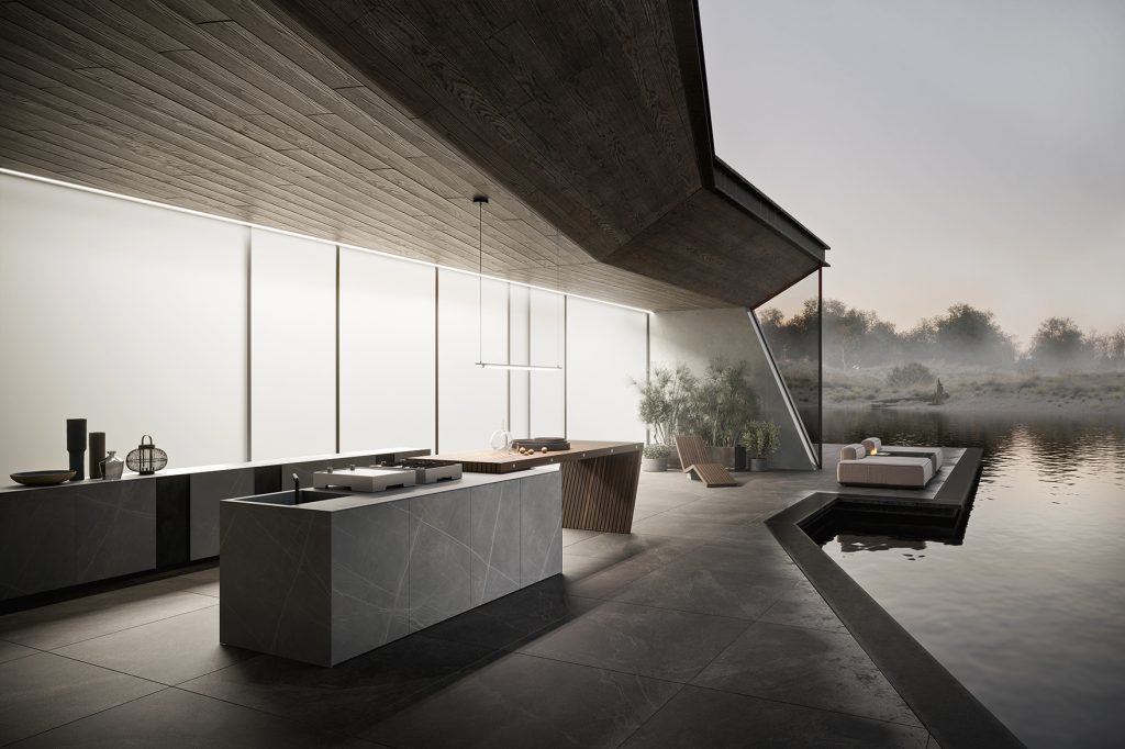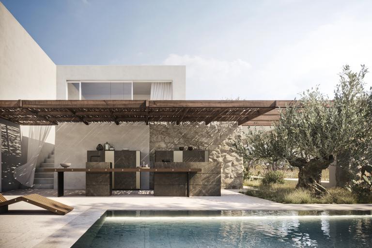Architettura che incontra il paesaggio. Materiali e volumi pensati per vivere all’esterno con naturale continuità.