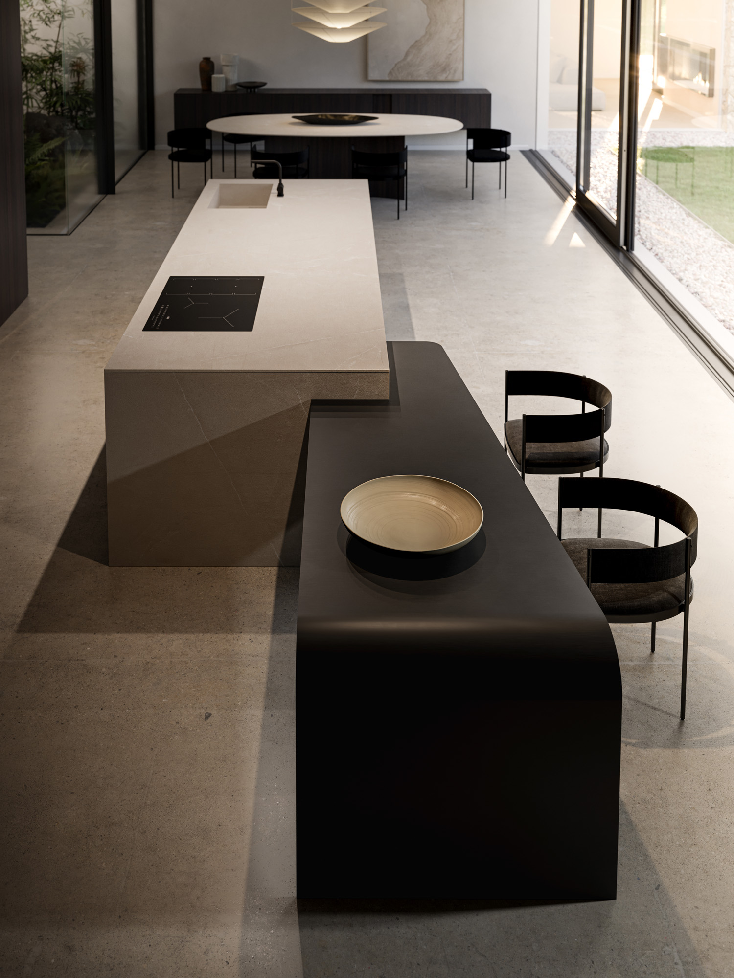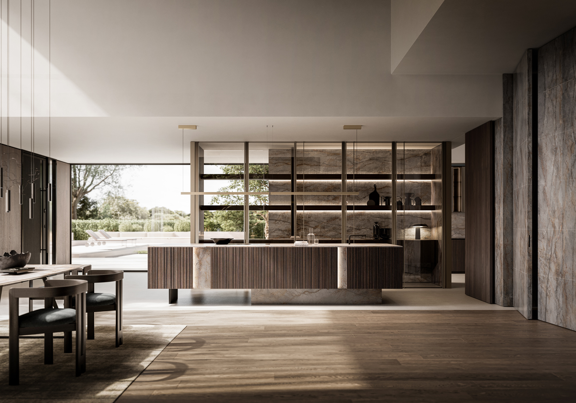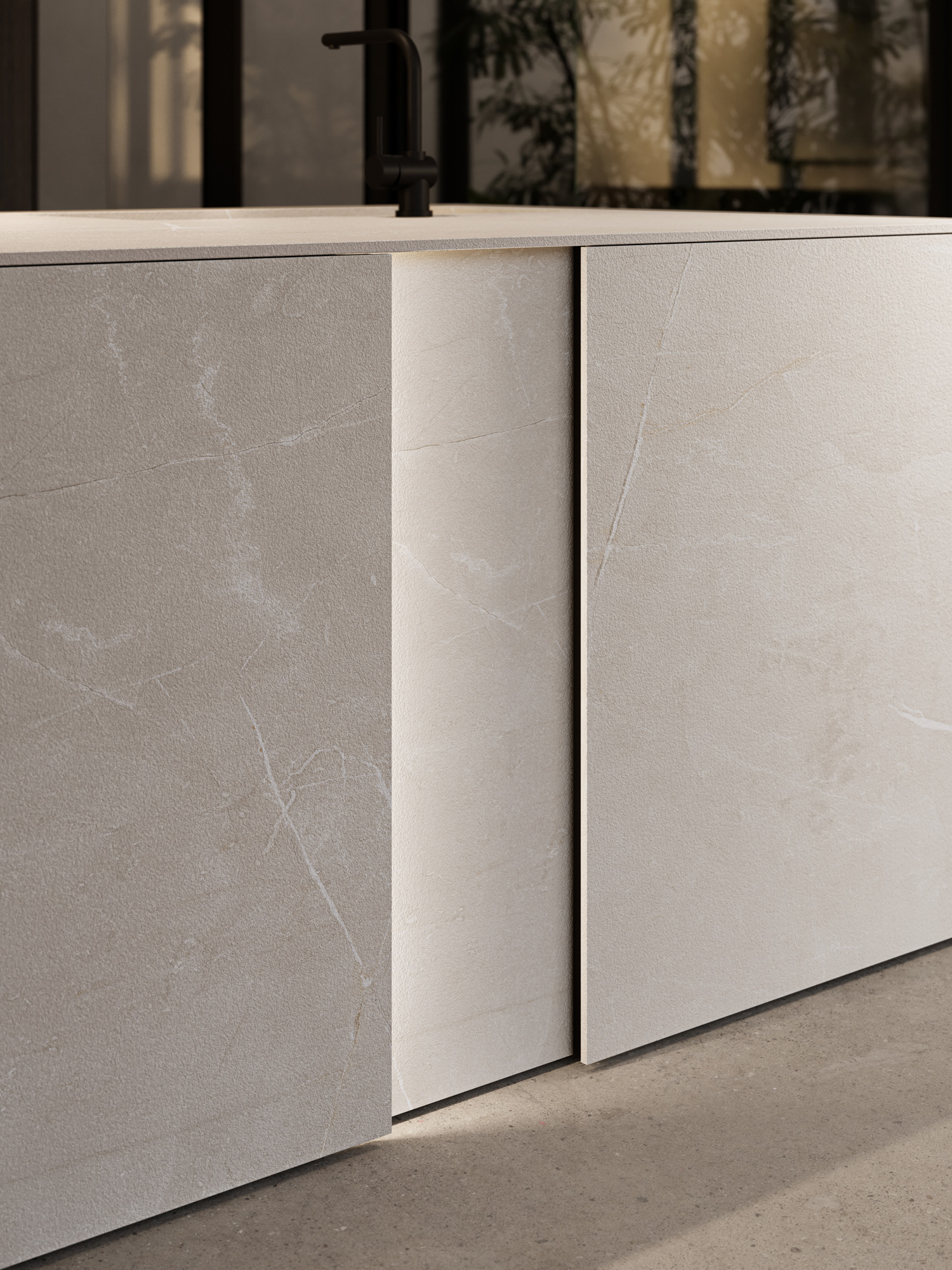 L’isola in Gold Pearl è un volume concepito come una scultura, dove le superfici appaiono essenziali, sofisticate e vibranti di texture. I pieni e i vuoti dell’elemento Vertical si alternano dando ritmo allo spazio e permettendo alla luce di disegnarne i contorni. Integrata all’isola, lo snack penisola Waterfall.