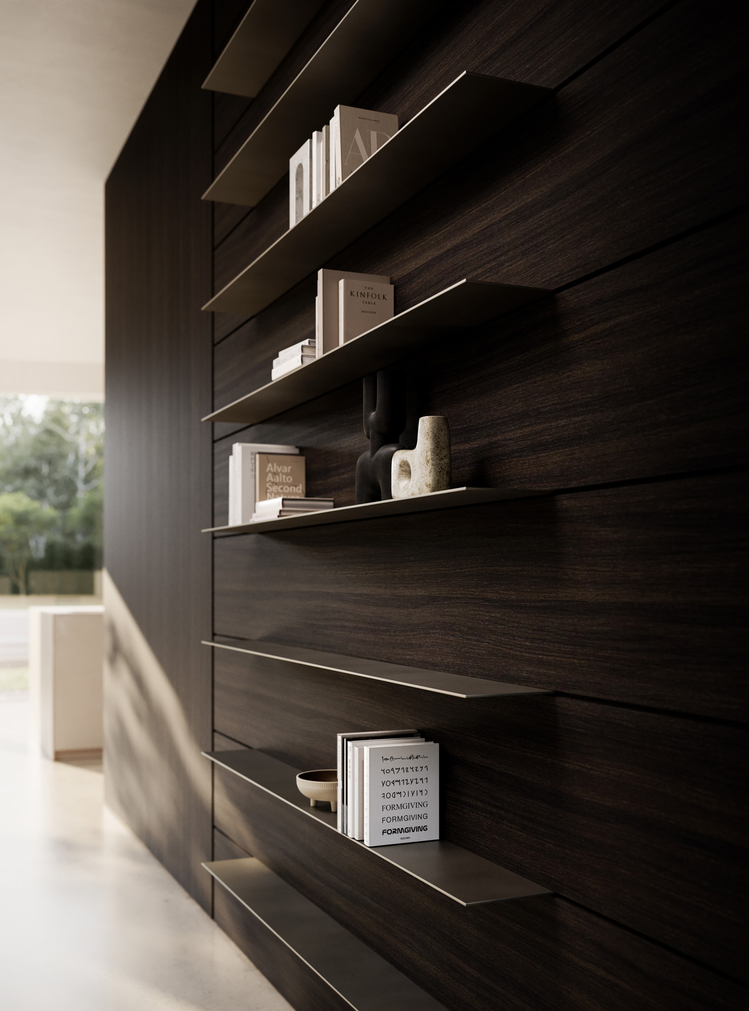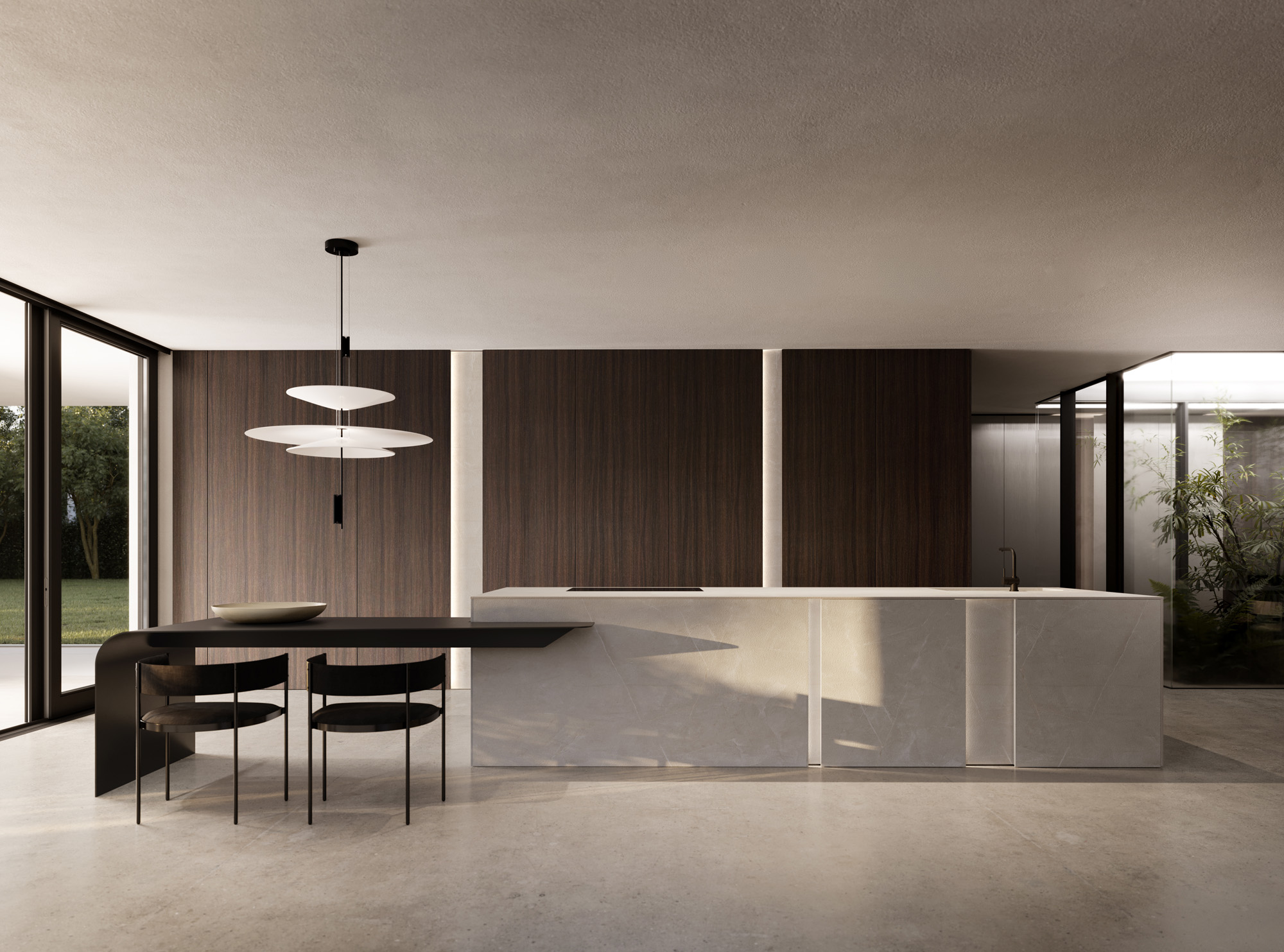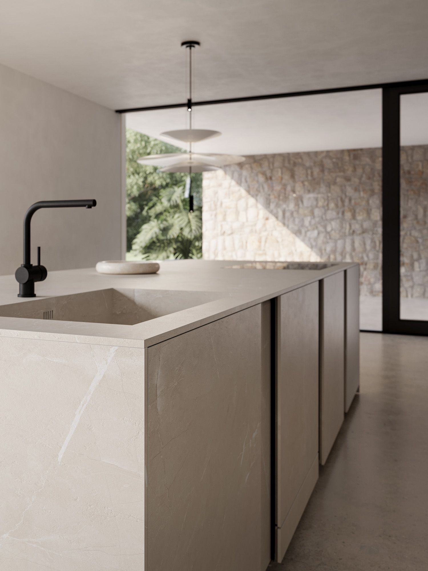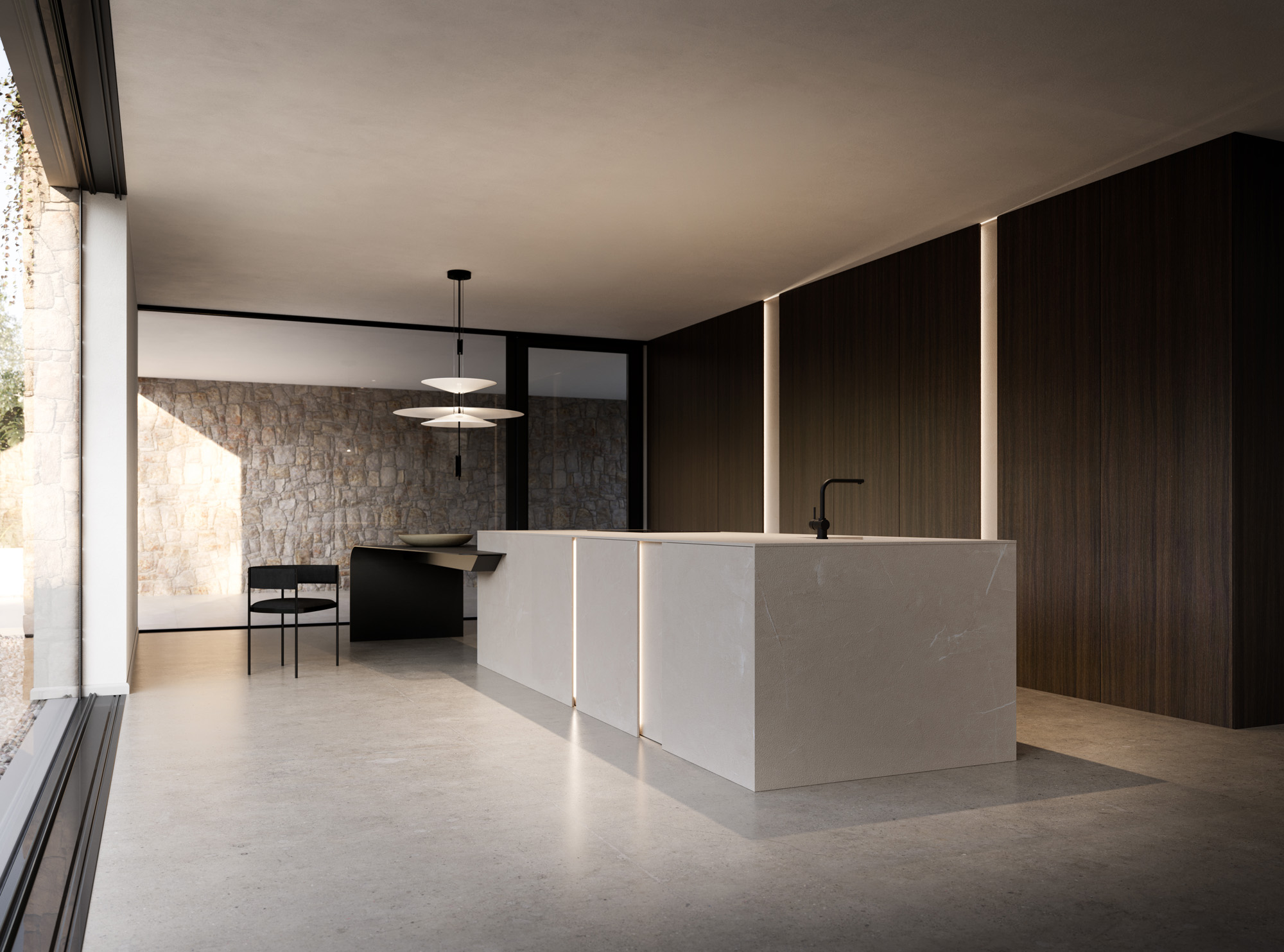 L’isola in Gold Pearl è un volume concepito come una scultura, dove le superfici appaiono essenziali, sofisticate e vibranti di texture. I pieni e i vuoti dell’elemento Vertical si alternano dando ritmo allo spazio e permettendo alla luce di disegnarne i contorni. Integrata all’isola, lo snack penisola Waterfall.