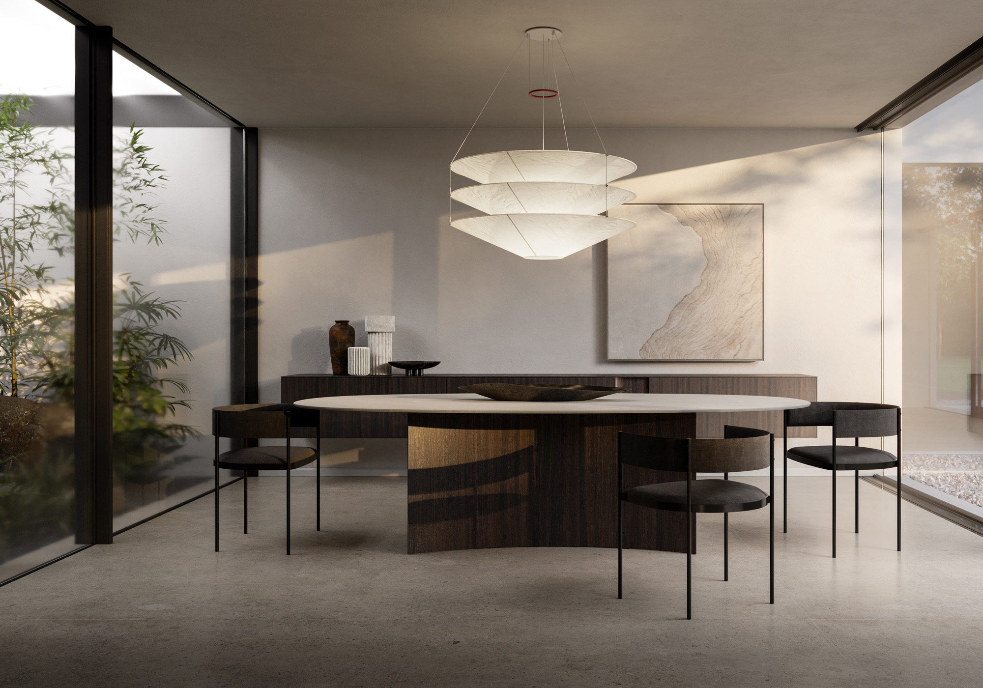 La forma ellittica e l’utilizzo di materiali naturali ne sottolineano il carattere equilibrato e la presenza nello spazio.