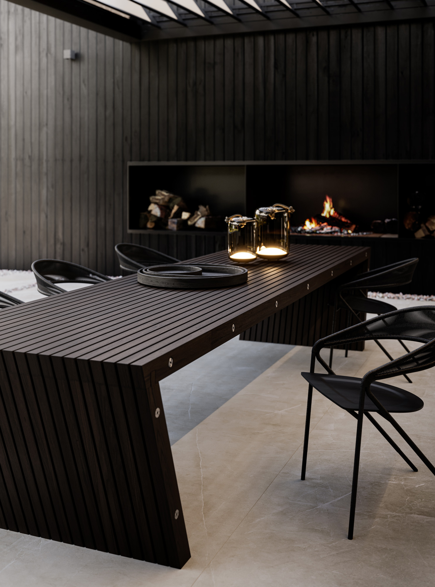 sartoriali che accostano con precisione listelli in legno massello di Frassino Dark. Pensato per ambienti indoor e outdoor, interpreta con continuità il progetto dello spazio attraverso una presenza essenziale e architettonica.