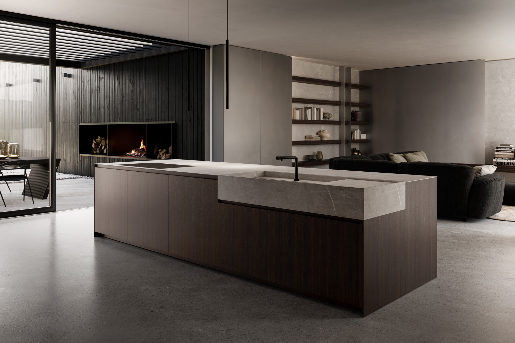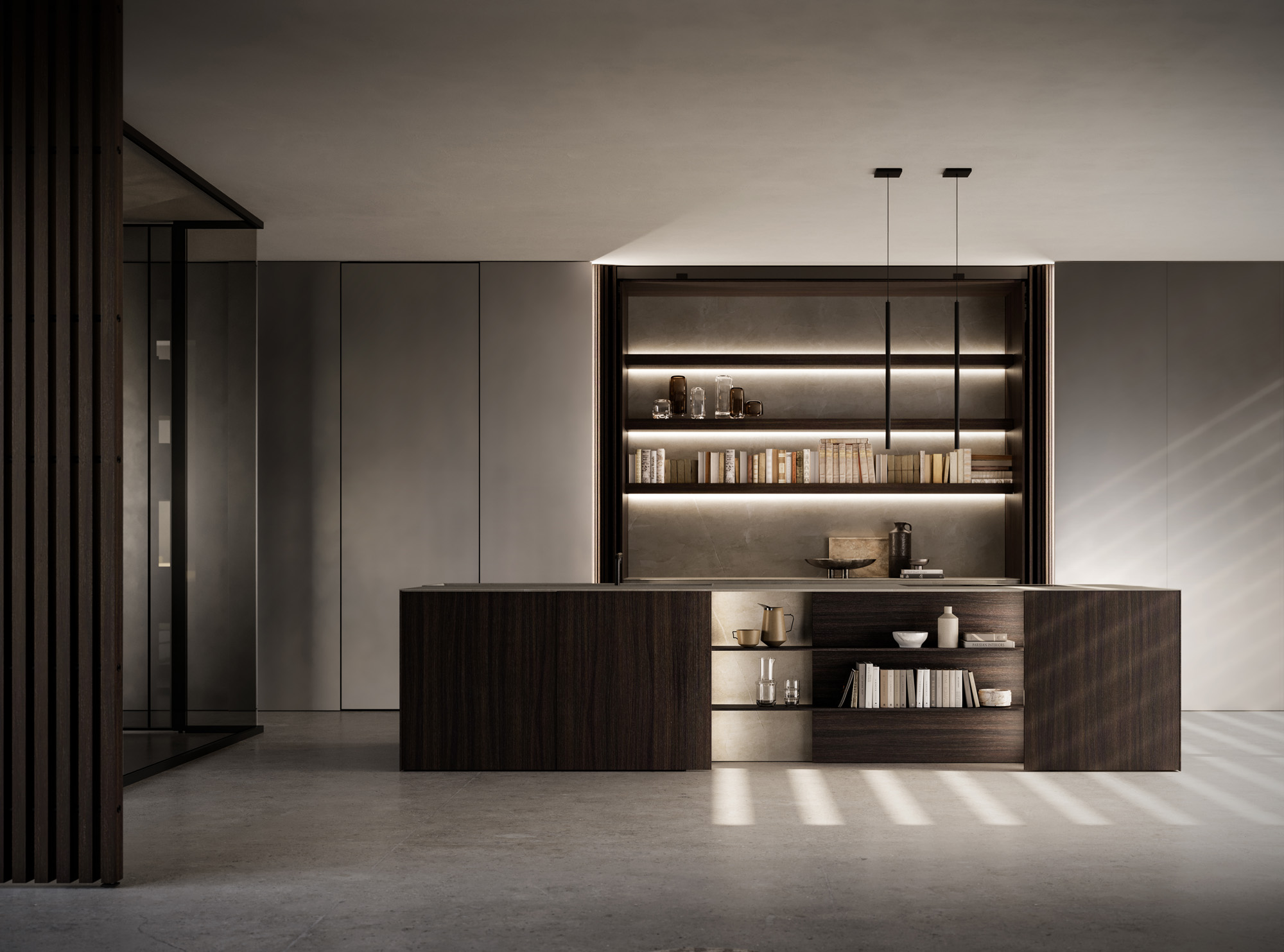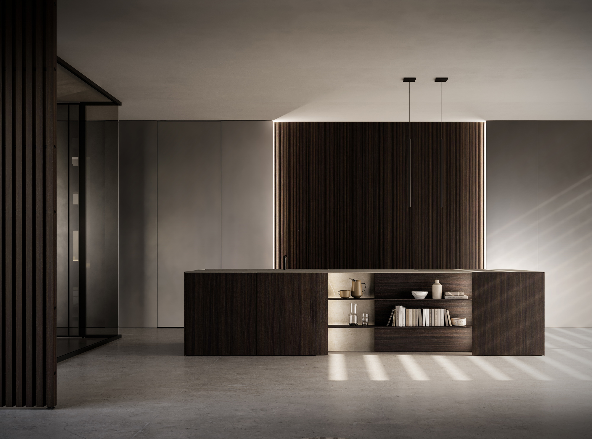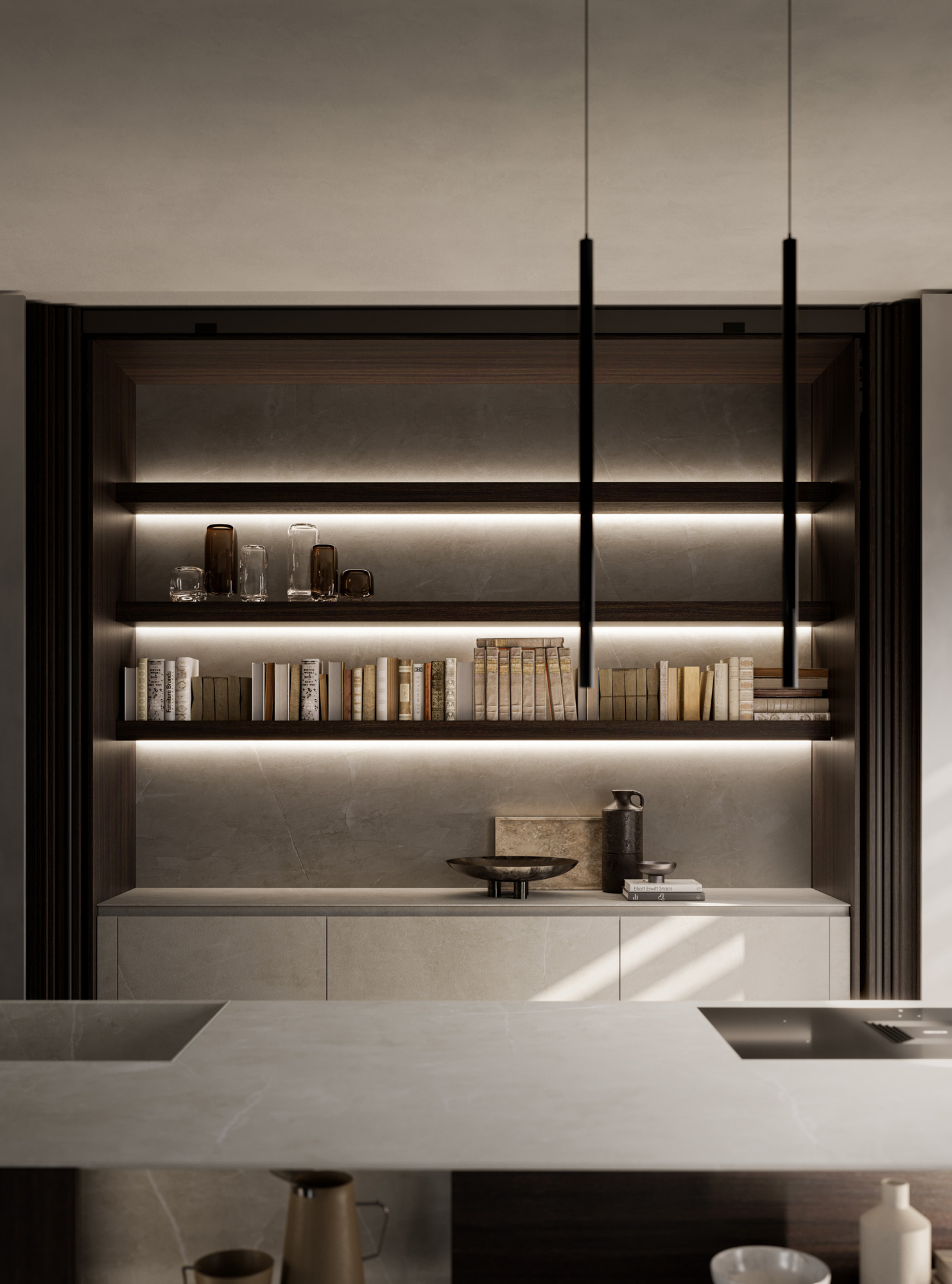 La continuità attraversa gli ambienti, connette legni, metalli, vetri e pietre in una sequenza cromatica calibrata di superfici opache, riflettenti e stratificate. Le soglie si dissolvono, i passaggi si integrano, le prospettive si aprono in profondità inattese.