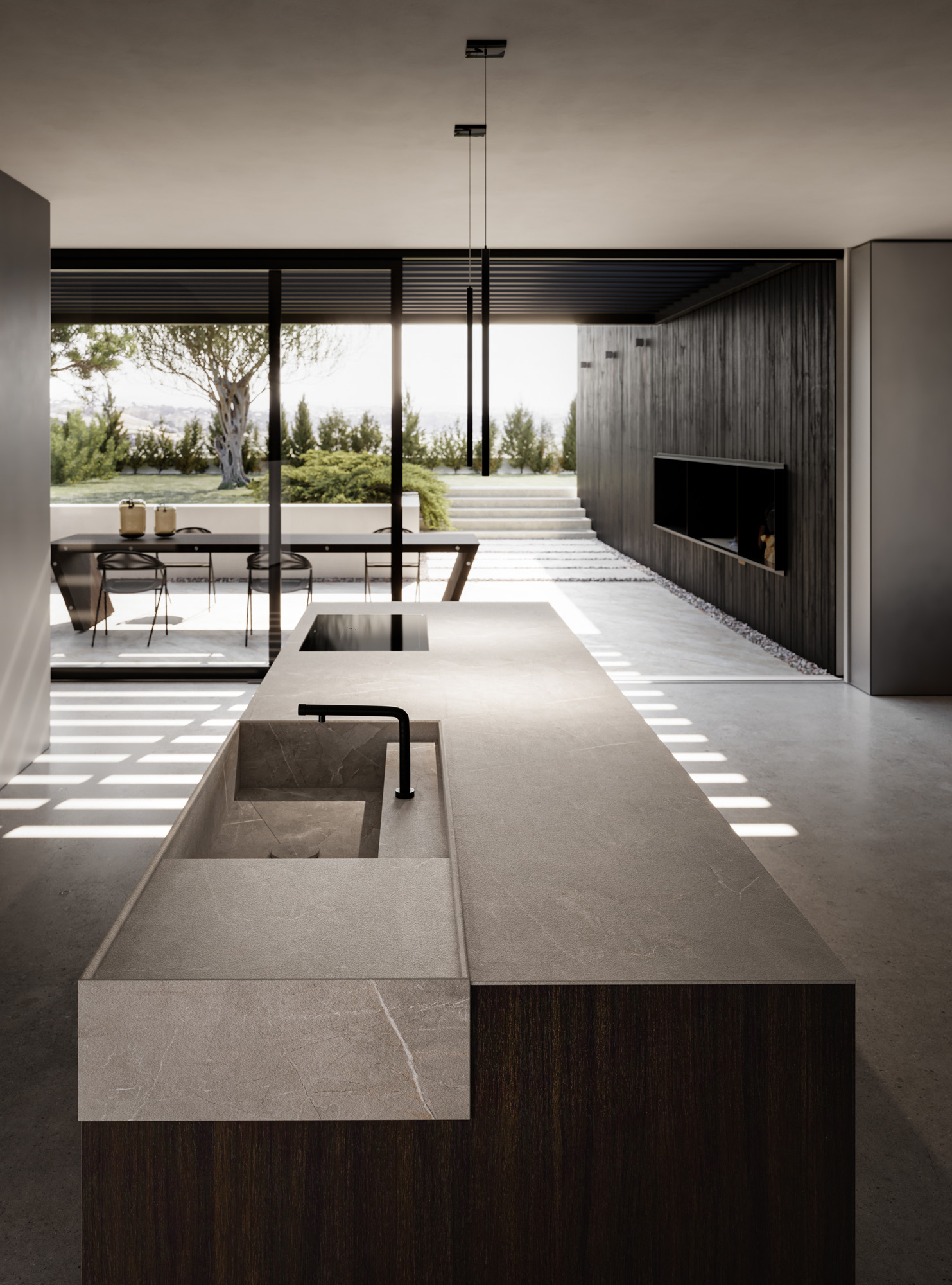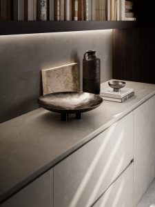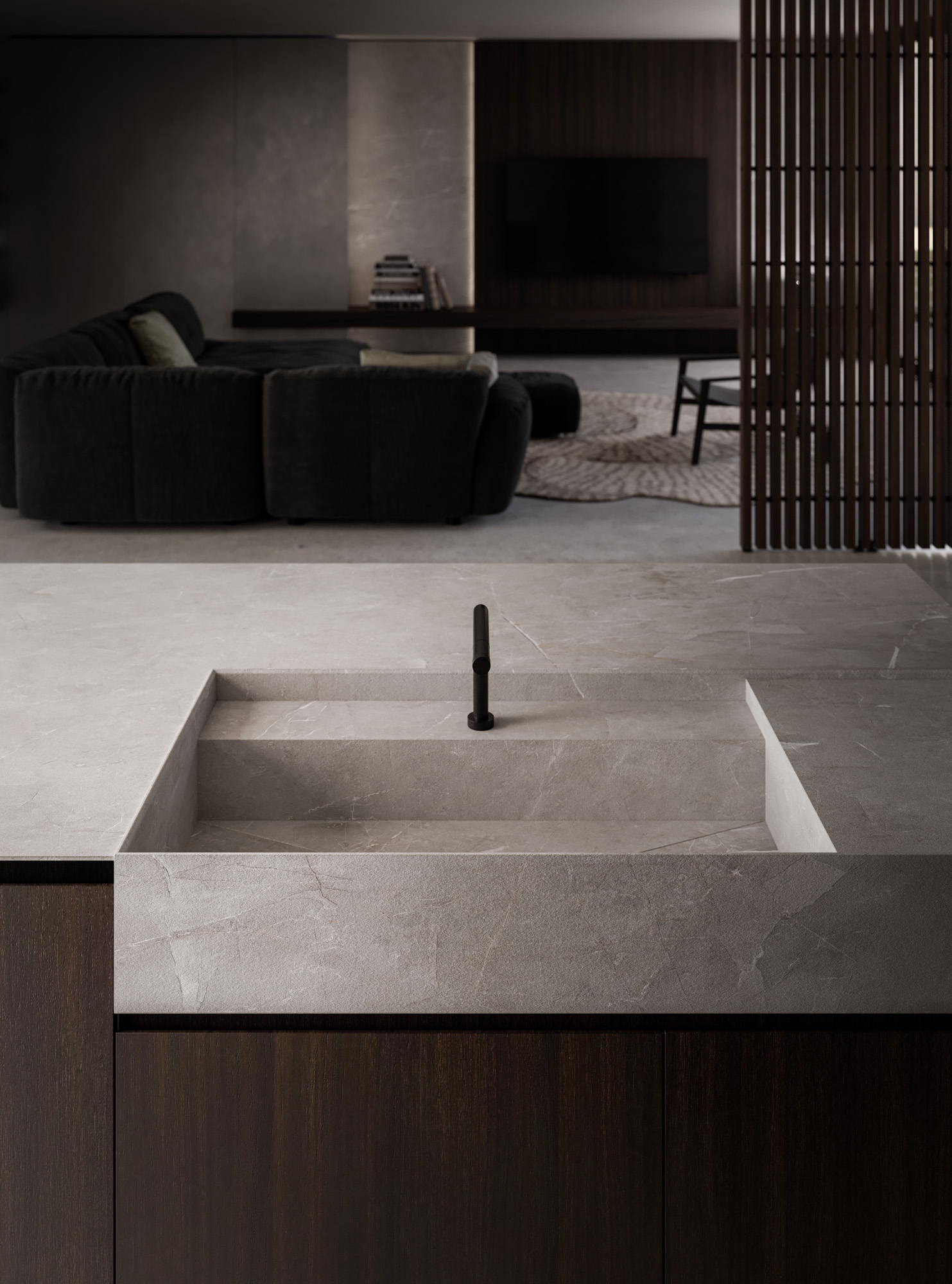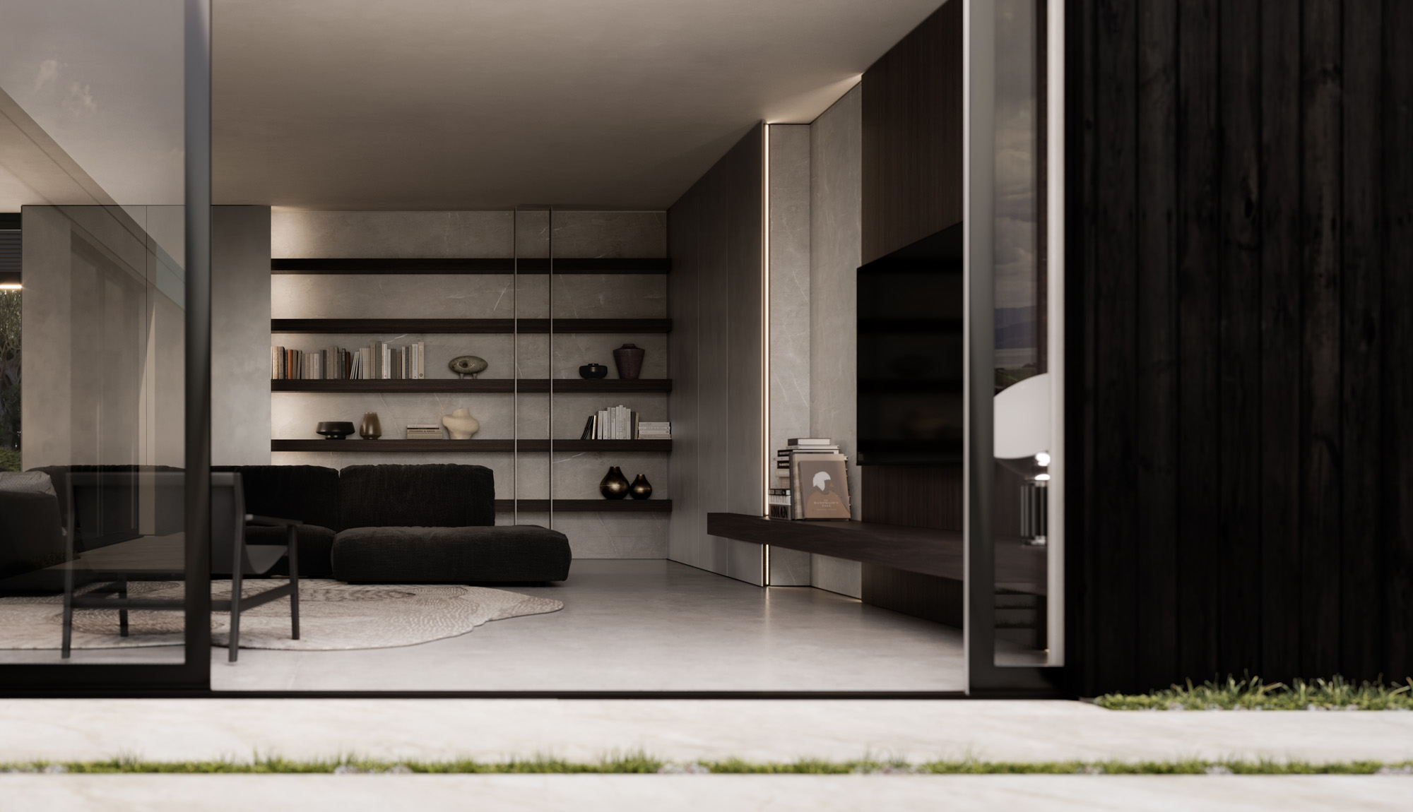 La continuità attraversa gli ambienti, connette legni, metalli, vetri e pietre in una sequenza cromatica calibrata di superfici opache, riflettenti e stratificate. Le soglie si dissolvono, i passaggi si integrano, le prospettive si aprono in profondità inattese.