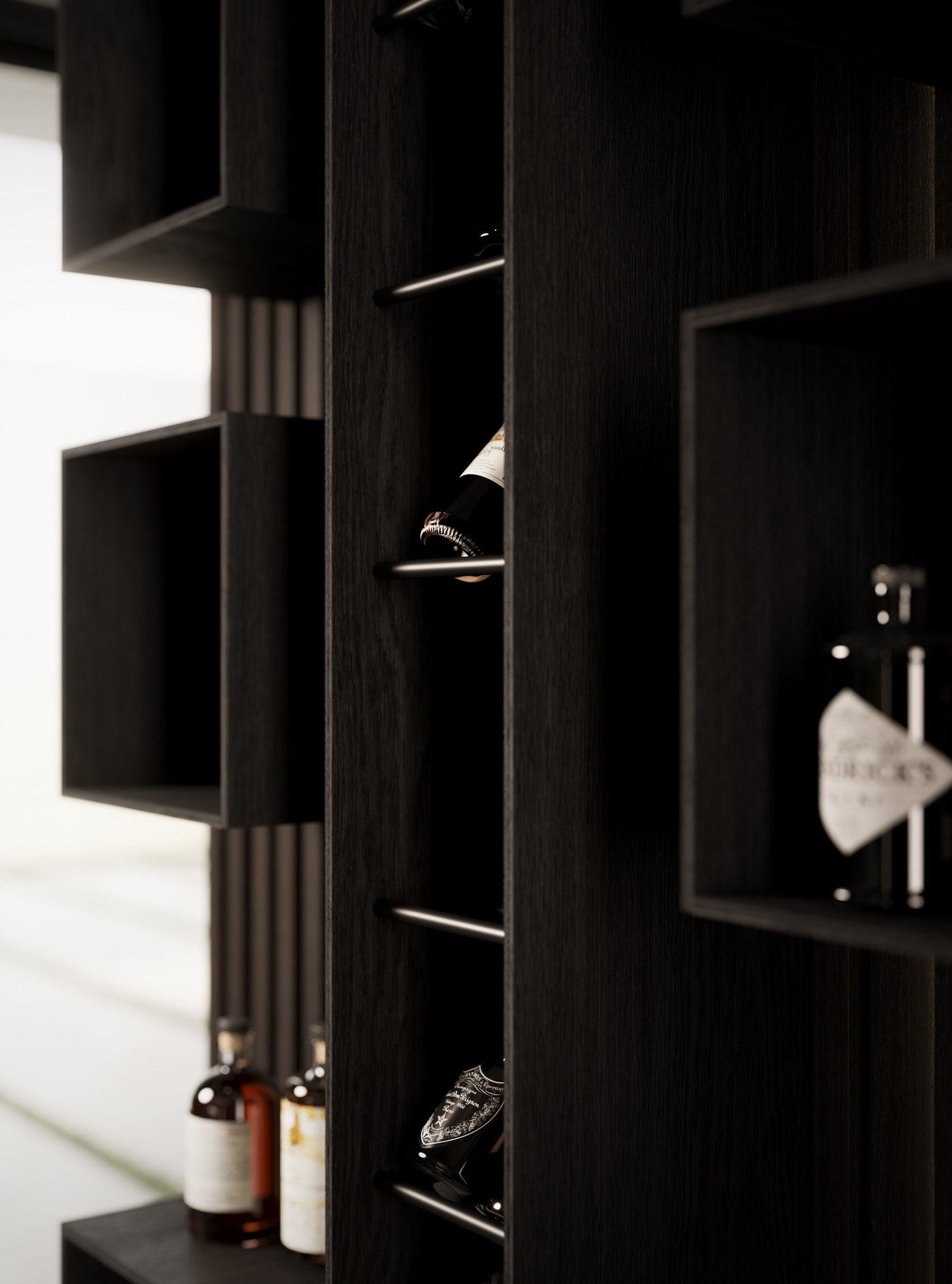Un cubo in vetro stratificato extrachiaro accoglie al suo interno il sistema interparete Solid: una struttura composta da listelli verticali in legno e completata da elementi a giorno liberamente configurabili. Ogni dettaglio contribuisce alla definizione dello spazio cantina, concepito come ambiente personalizzabile nelle dimensioni e nelle finiture. Il sistema Solid, con la naturale matericità del legno e lo schienale retroilluminato, suddivide l’ambiente e ne caratterizza l’architettura, offrendo nuove possibilità di configurazione e interpretazione dello spazio.