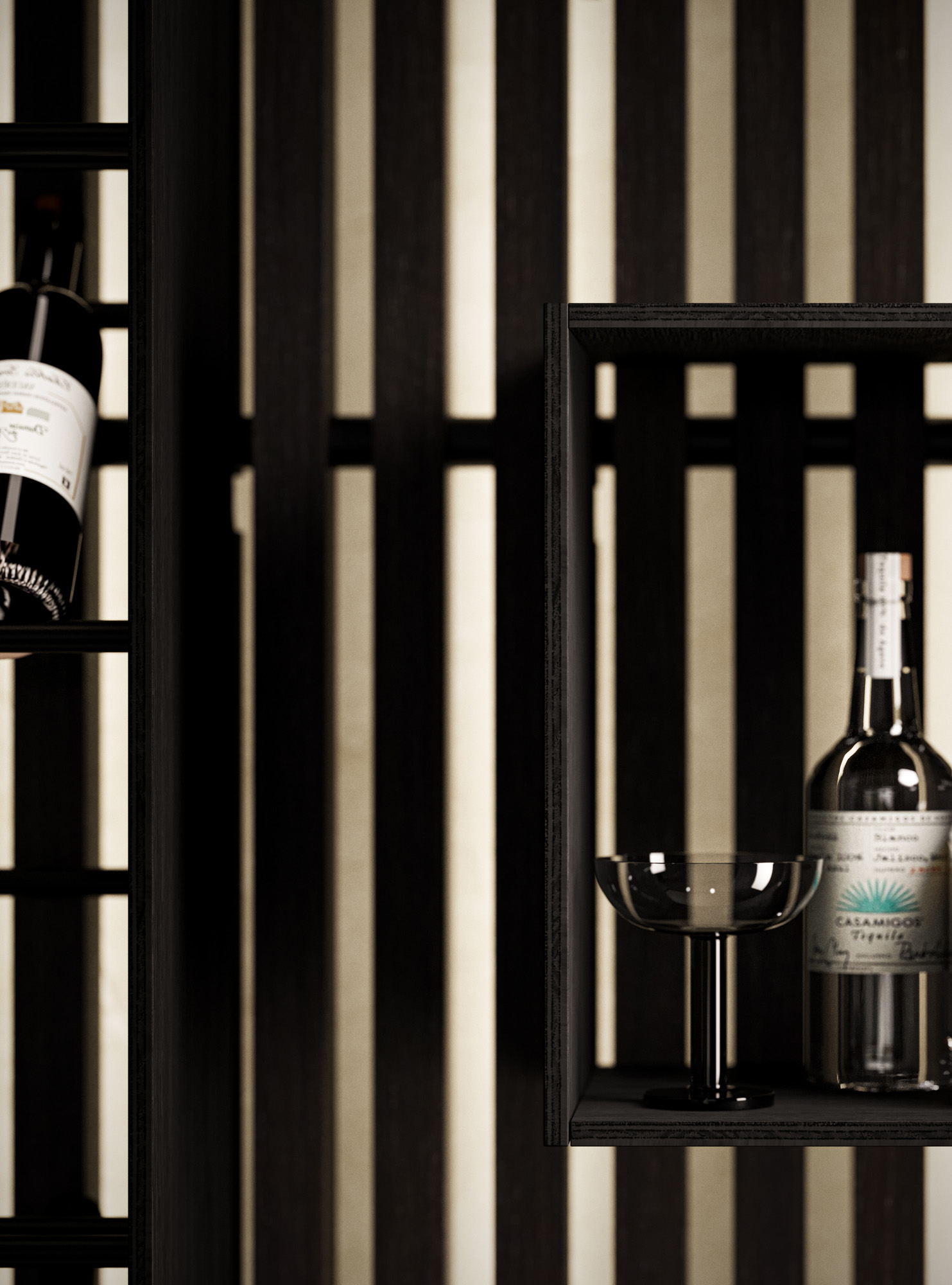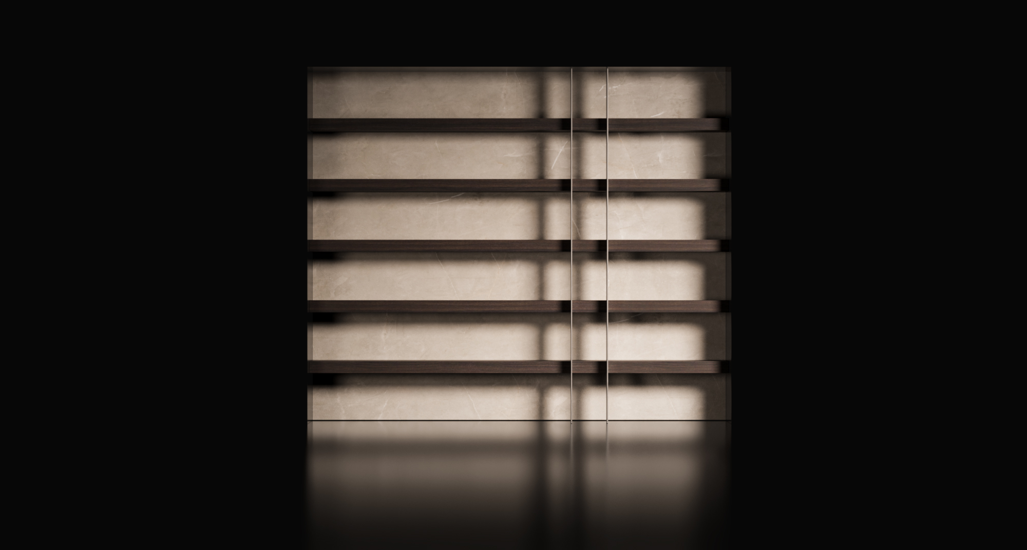 Lo spazio prende forma attraverso una sequenza di volumi alternati, intersezioni e profondità che costruiscono un ritmo visivo ordinato e coerente. Le superfici si articolano in pieni e sporgenze, generando una composizione dinamica in cui ogni elemento contribuisce all’equilibrio complessivo. La luce radente ne rivela il disegno, enfatizzando le geometrie e la matericità, mentre le colonne Blade a tutta altezza si integrano nel progetto, dialogando con il linguaggio architettonico dell’ambiente.