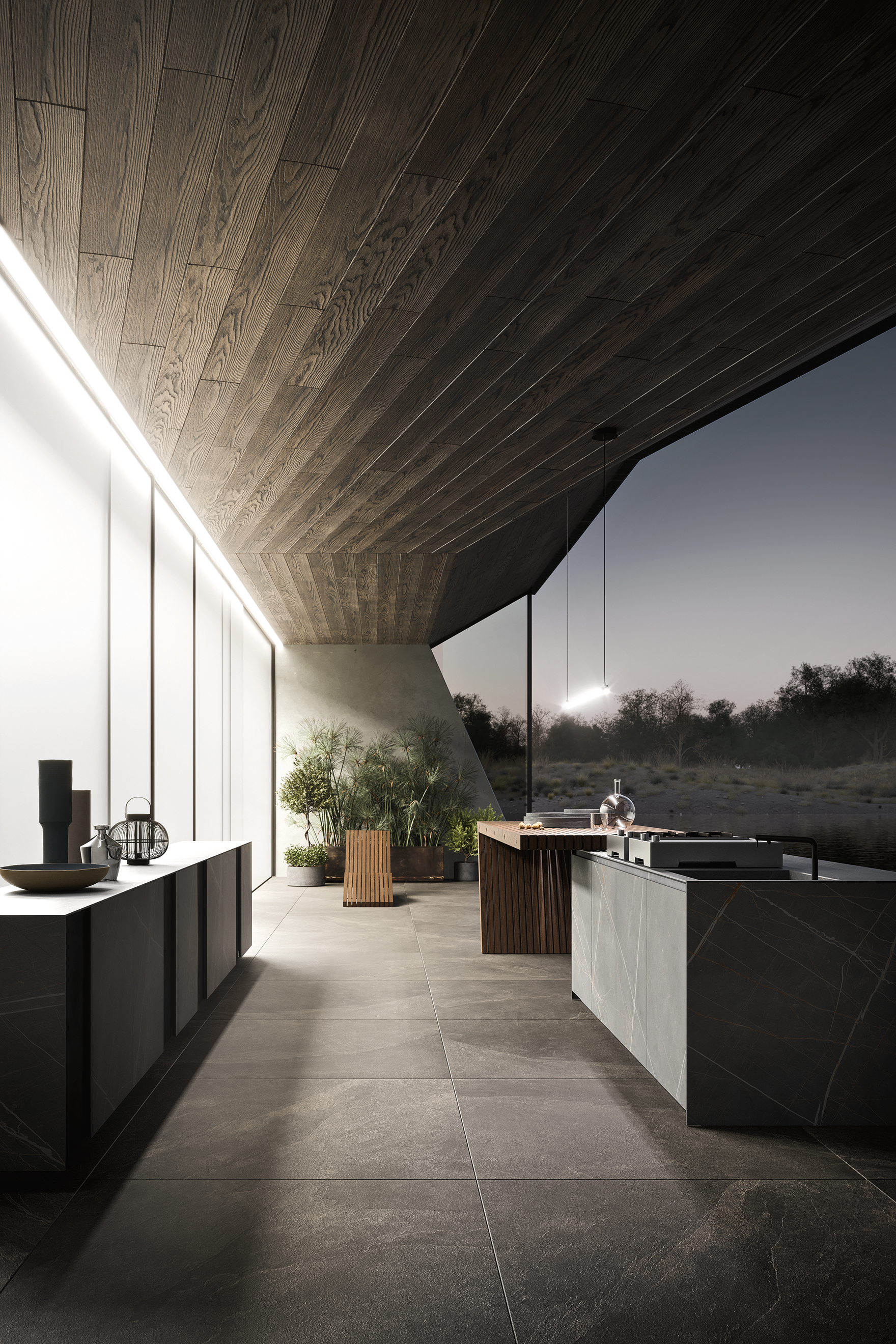 Project 04 interprets the outdoors through the Skill Gres system, clad in Sahara Noir Raw. The dark surface, traversed by deep veins, builds a rigorous volume that dialogues with natural light and its surroundings.