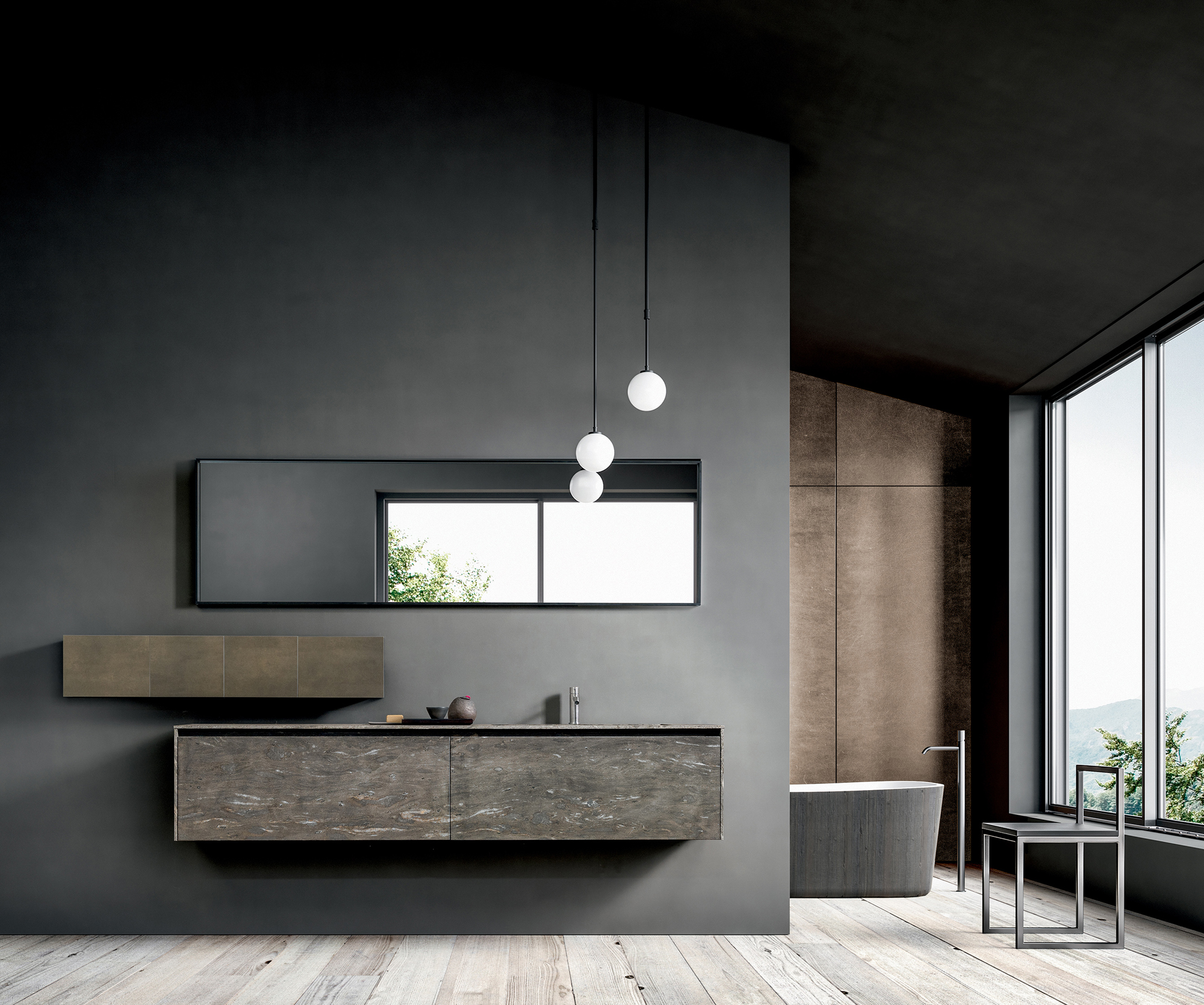 Il programma Blade Lab comprende basi con frontali in pietra, marmo o granito naturale dello spessore di 1,5 cm. La struttura dell’anta, con corpo interno in alveolare di alluminio o fibra di vetro, unisce solidità e leggerezza.