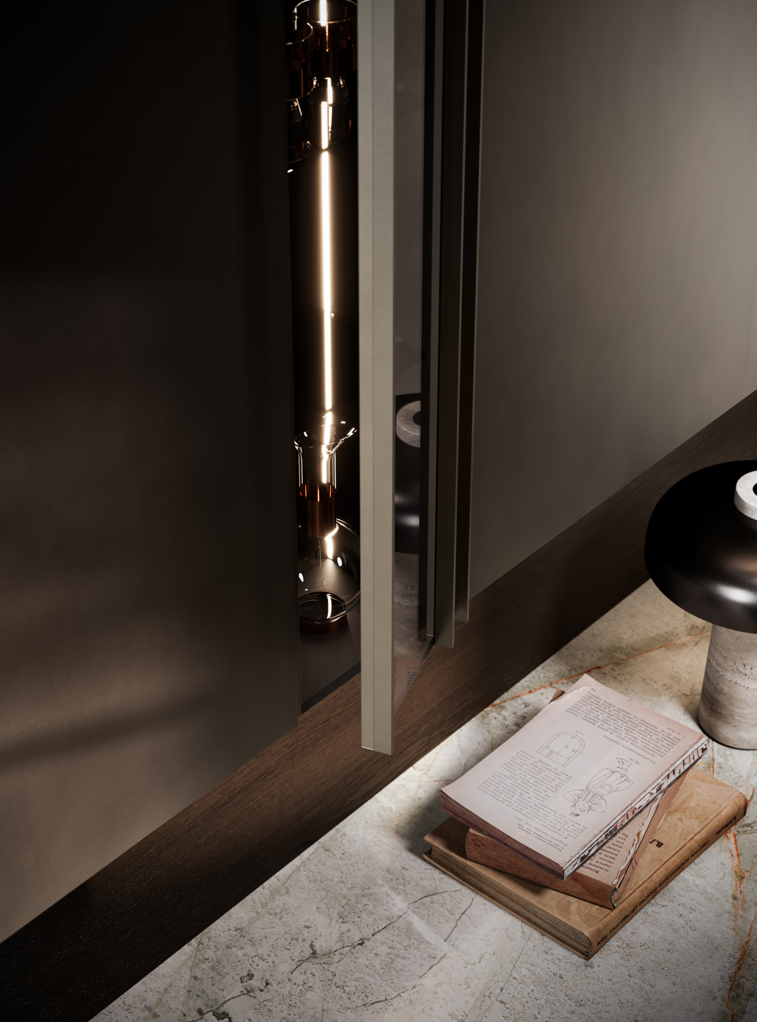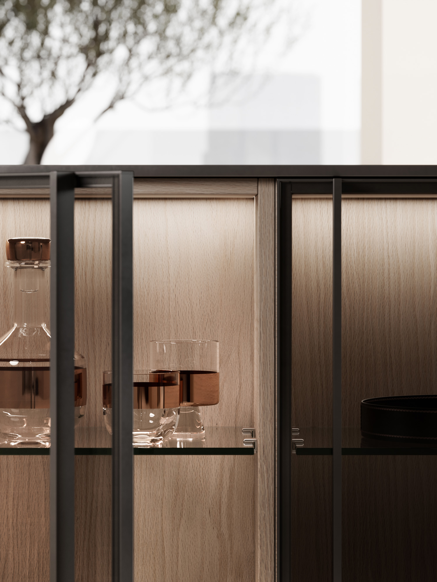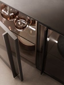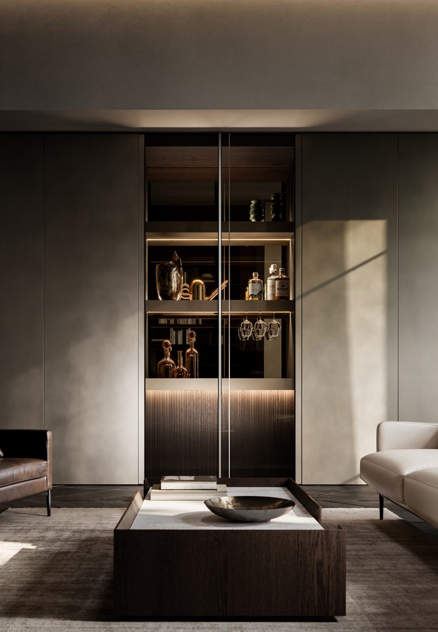 Il vetro personalizzabile è disponibile nelle finiture trasparente, fumé e bronze.La cover personalizzabile amplia ulteriormente le possibilità compositive ed è disponibile nelle finiture Milltech, Super Matt, laccato satinato, laccato metal, Rovere , Noce, Eucalipto e Metalli Dust. Dal punto di vista costruttivo, un profilo svolge funzione strutturale, mentre l'altro profilo costituisce la presa maniglia per l’apertura dell’anta. Questa distinzione consente di integrare funzione e disegno in un unico elemento, mantenendo rigore formale e continuità visiva. Il risultato è un sistema vetrato altamente configurabile, capace di adattarsi a linguaggi materici differenti e di dialogare con continuità con gli altri frontali del progetto.