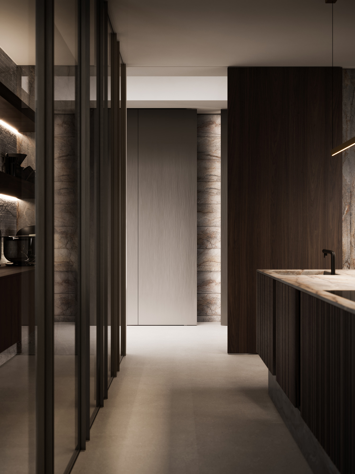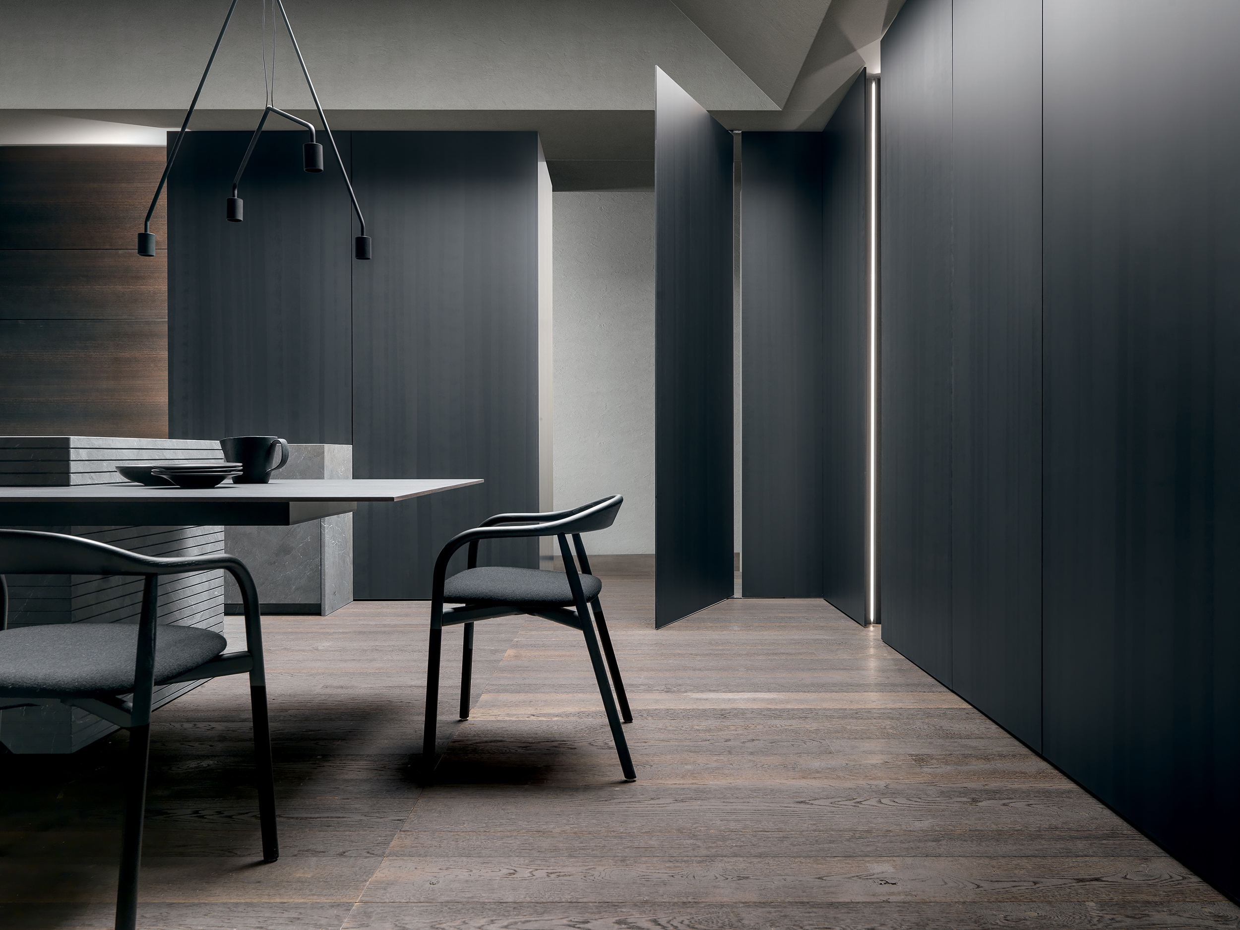 Bilico Atelier Nella granda boiserie Atelier si inserisce la porta Bilico che consente di accedere alla Service Kitchen. La cultura della boiserie di manifattura evolve in sistema: la superficie diventa disegno, il disegno diventa architettura. Il sistema Atelier, qui in Rovere Caramel Arc e realizzato con struttura in alveolare di alluminio, introduce una lavorazione sartoriale capace di costruire trame in relazione allo spazio, alle sue proporzioni e ai volumi che lo attraversano. I passi generano una grammatica aperta, da cui nascono linee verticali, orizzontali, campiture geometriche e configurazioni più complesse per boiserie, ante e porte di passaggio.