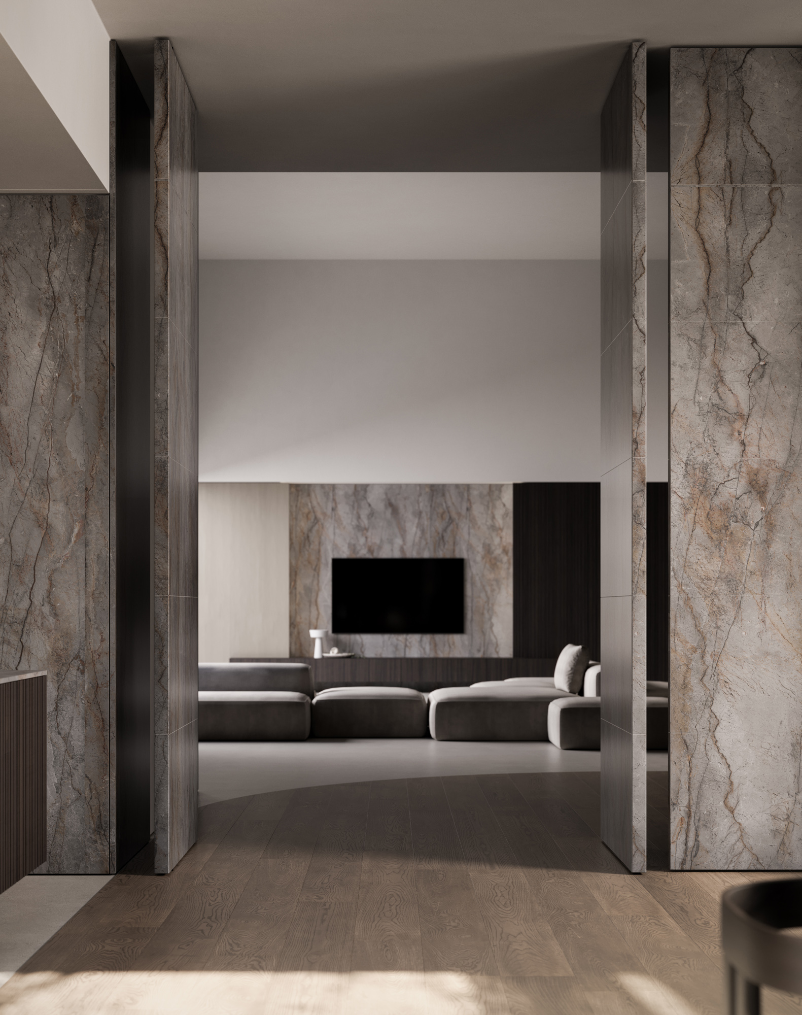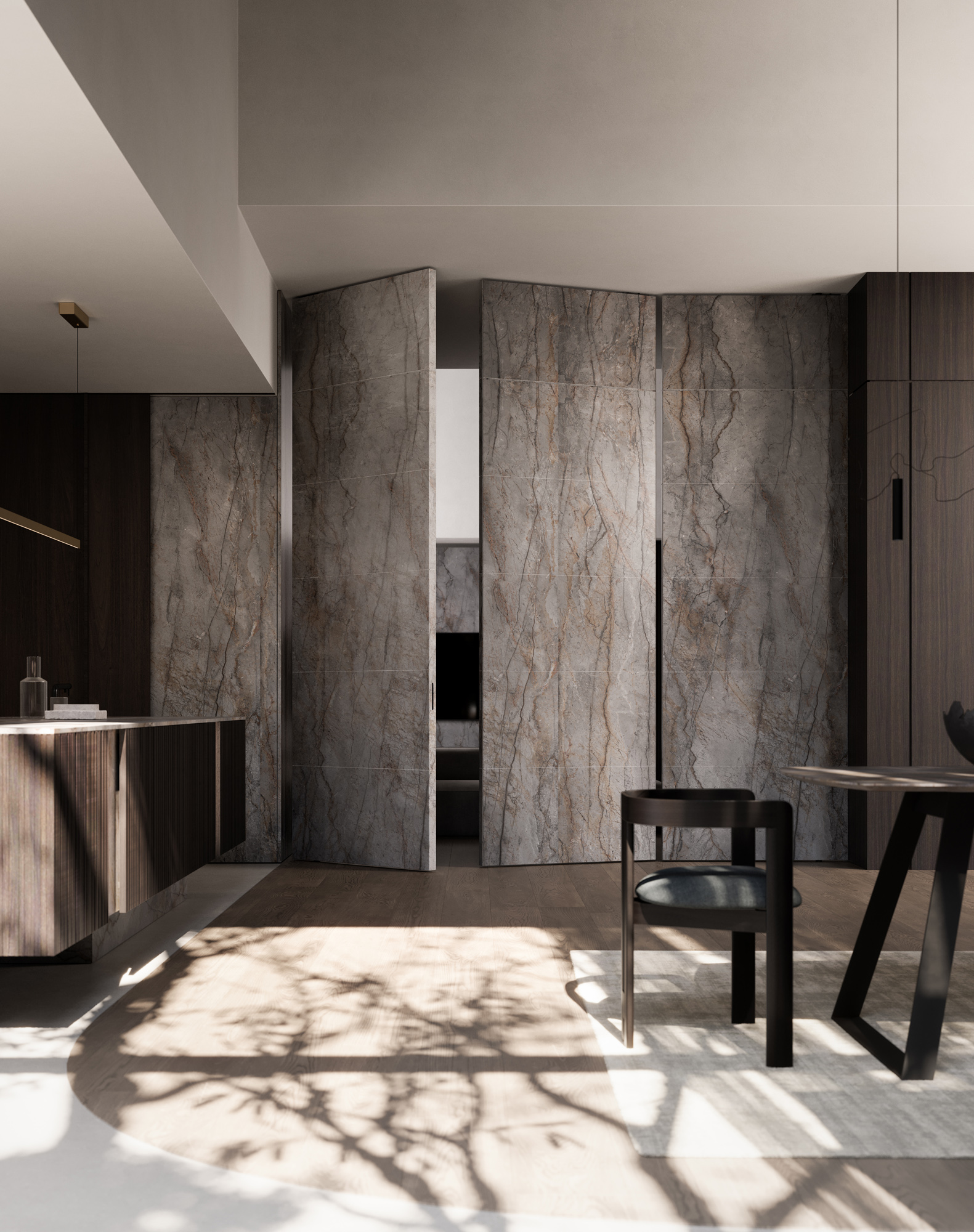 L’anta in Pietra è qui presentata in marmo Silver Roots. Un marmo naturale che cattura lo sguardo con la sua bellezza inusuale e la sua raffinata eleganza. Questo marmo è il protagonista silenzioso di spazi lussuosi ed esprime un fascino senza tempo. L’anta, qui costruita con il sistema Bilico, raggiunge un’altezza di 315 cm x 115 cm di larghezza con uno spessore totale di 6 cm, formato da 4,4 cm di supporto tecnico e 0,8 cm di pietra per lato.