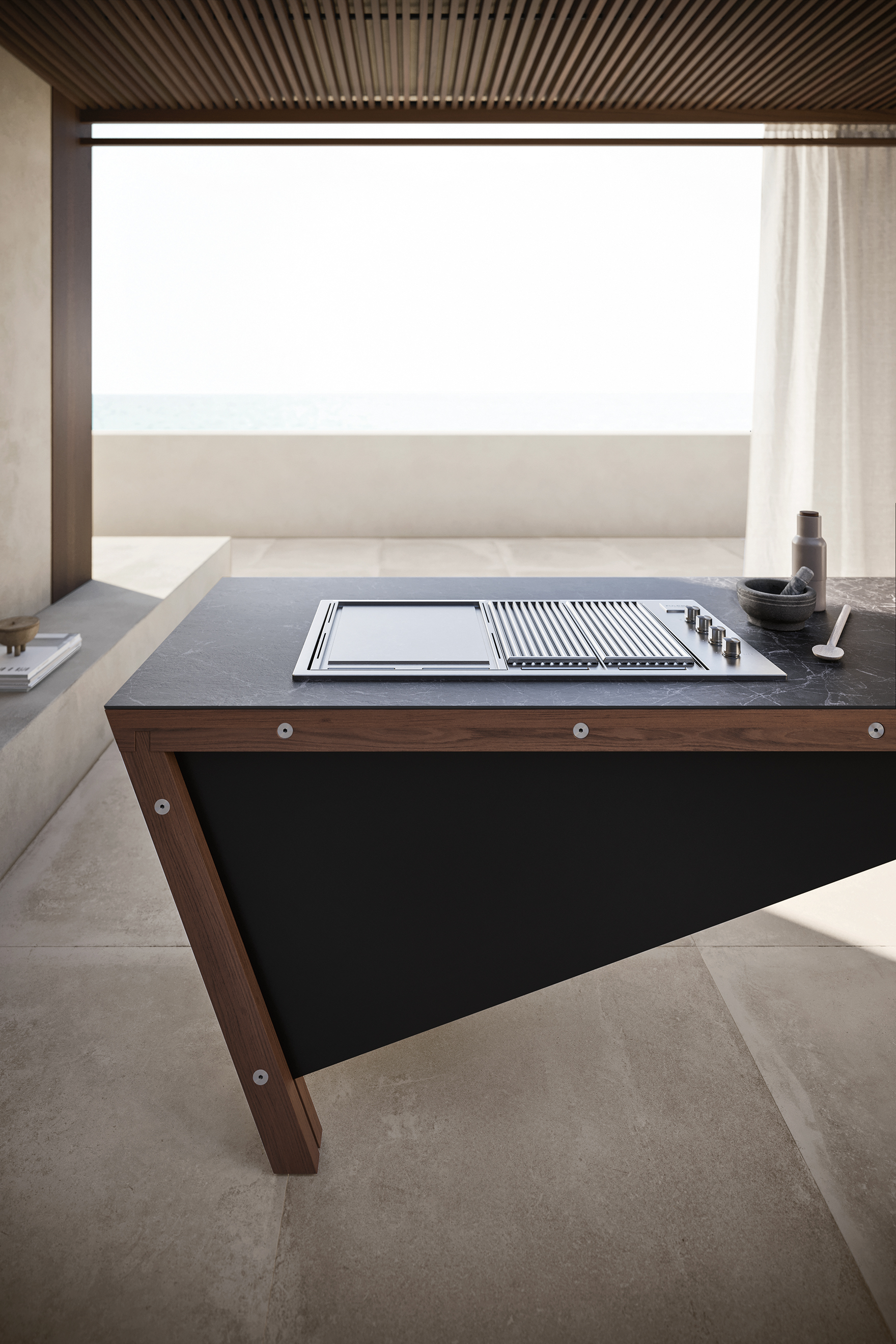 Il top in gres Nero Greco spessore 12 mm integra il piano cottura in acciaio inox AISI 316, garantendo resistenza agli agenti atmosferici e continuità formale.