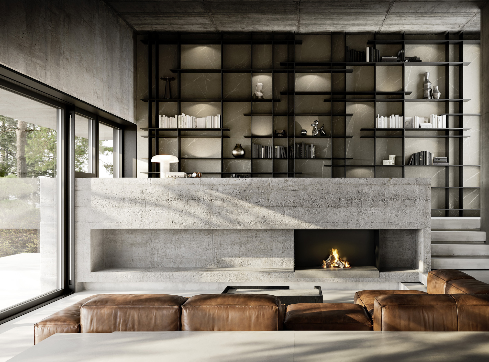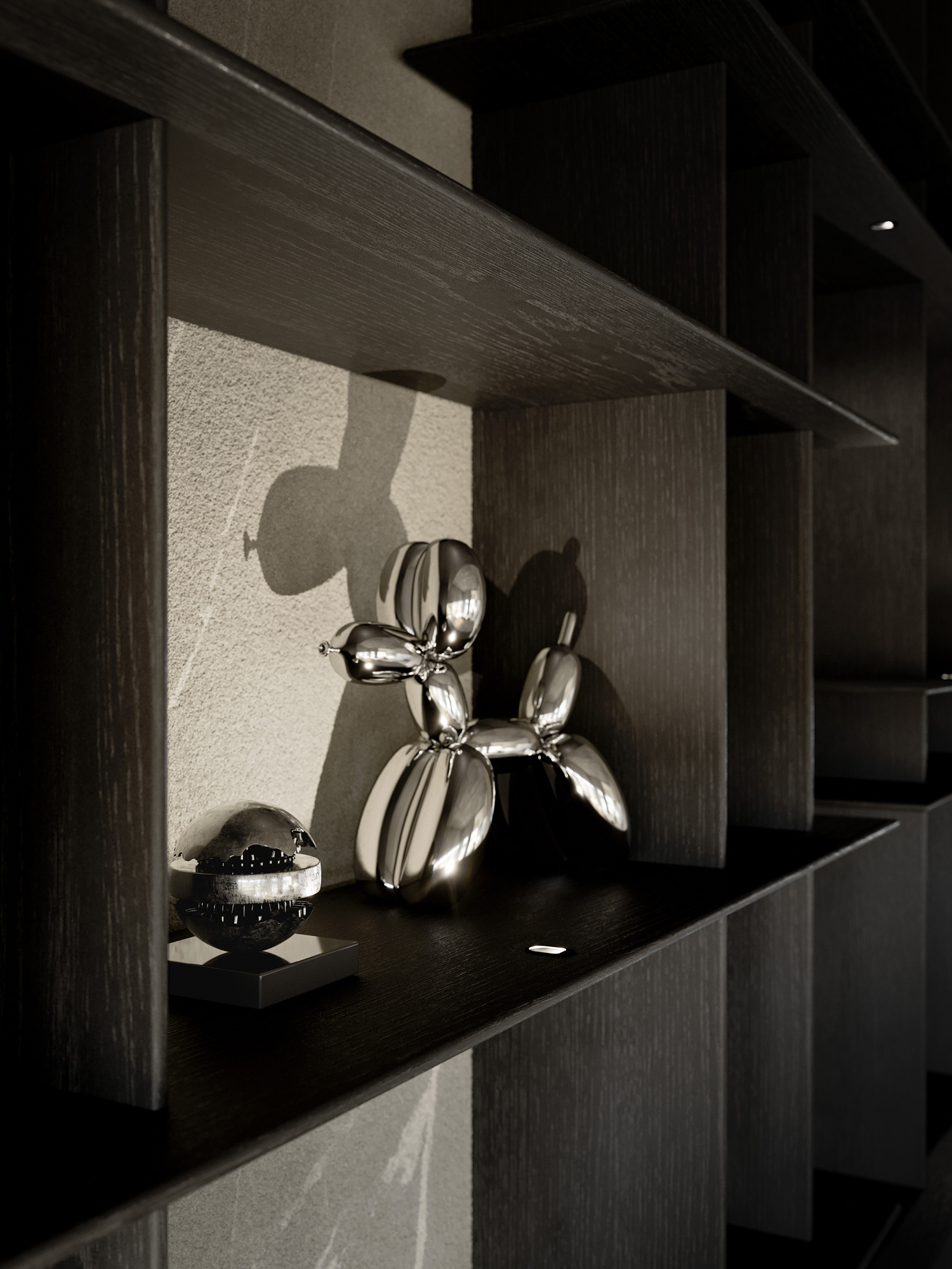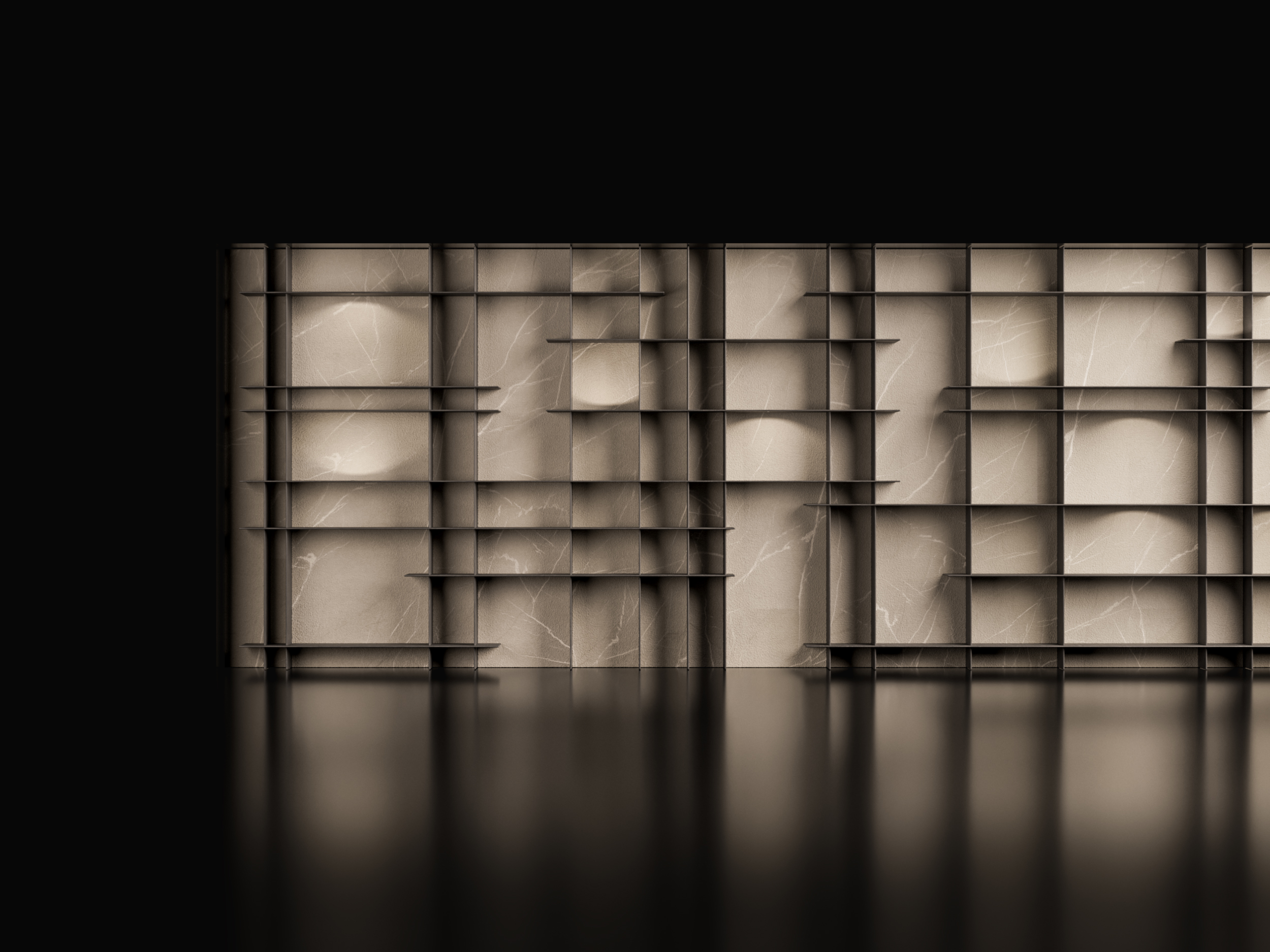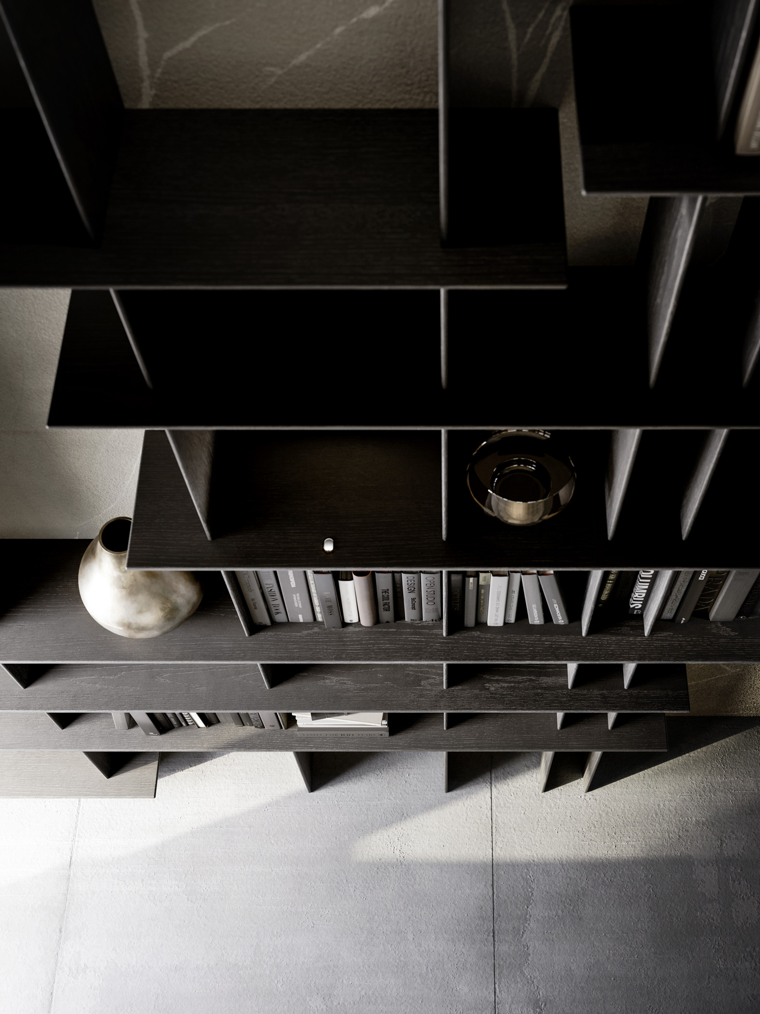 La luce, affidata a faretti puntiformi integrati e nascosti alla vista, interviene in modo selettivo sui vani verticali. Illumina lo schienale in Pietra Piasentina creando un'atmosfera teatrale: attraversa la libreria, rivela le superfici, intensifica la materia e definisce una sequenza di giochi di luce e ombra.