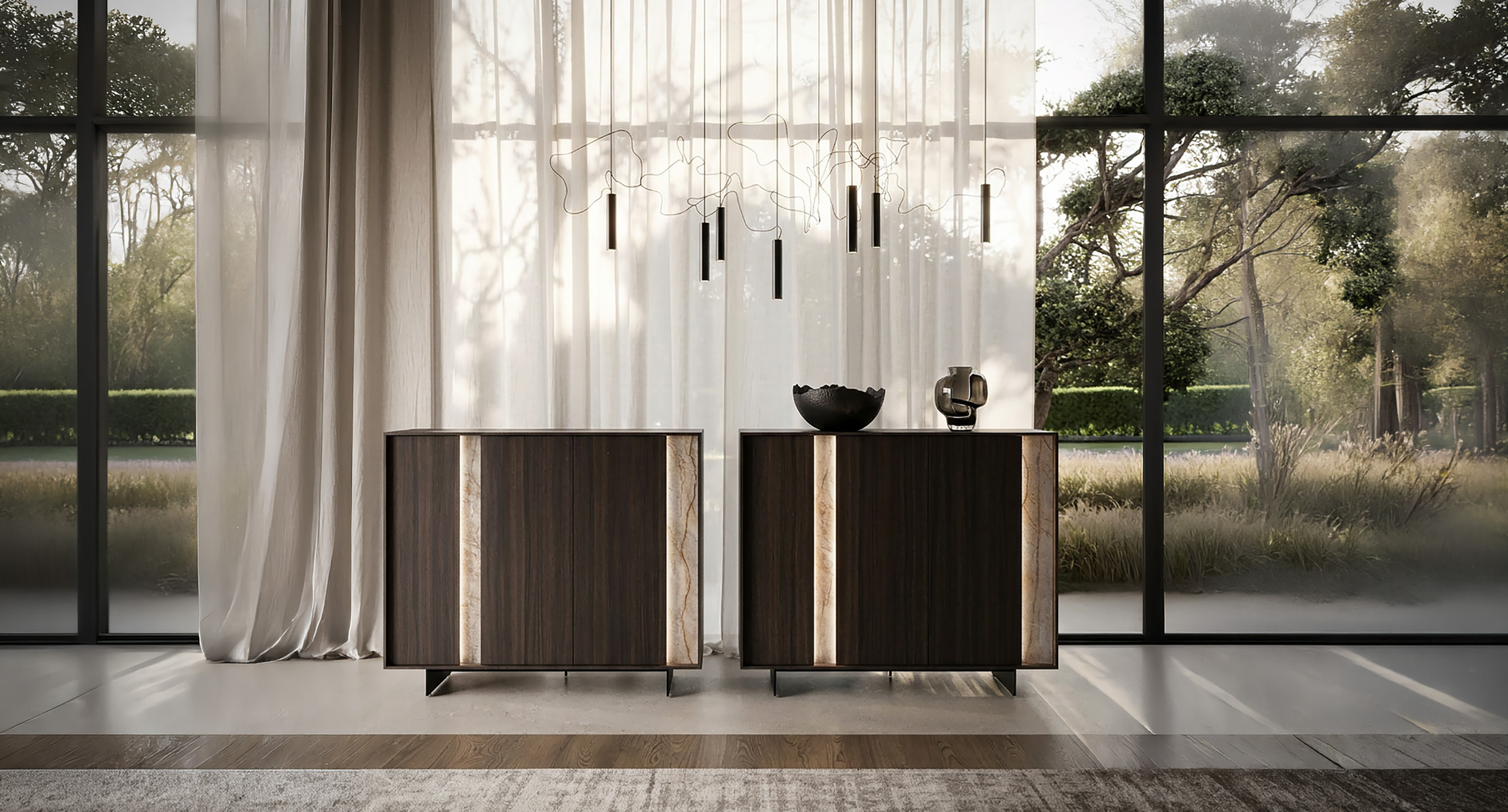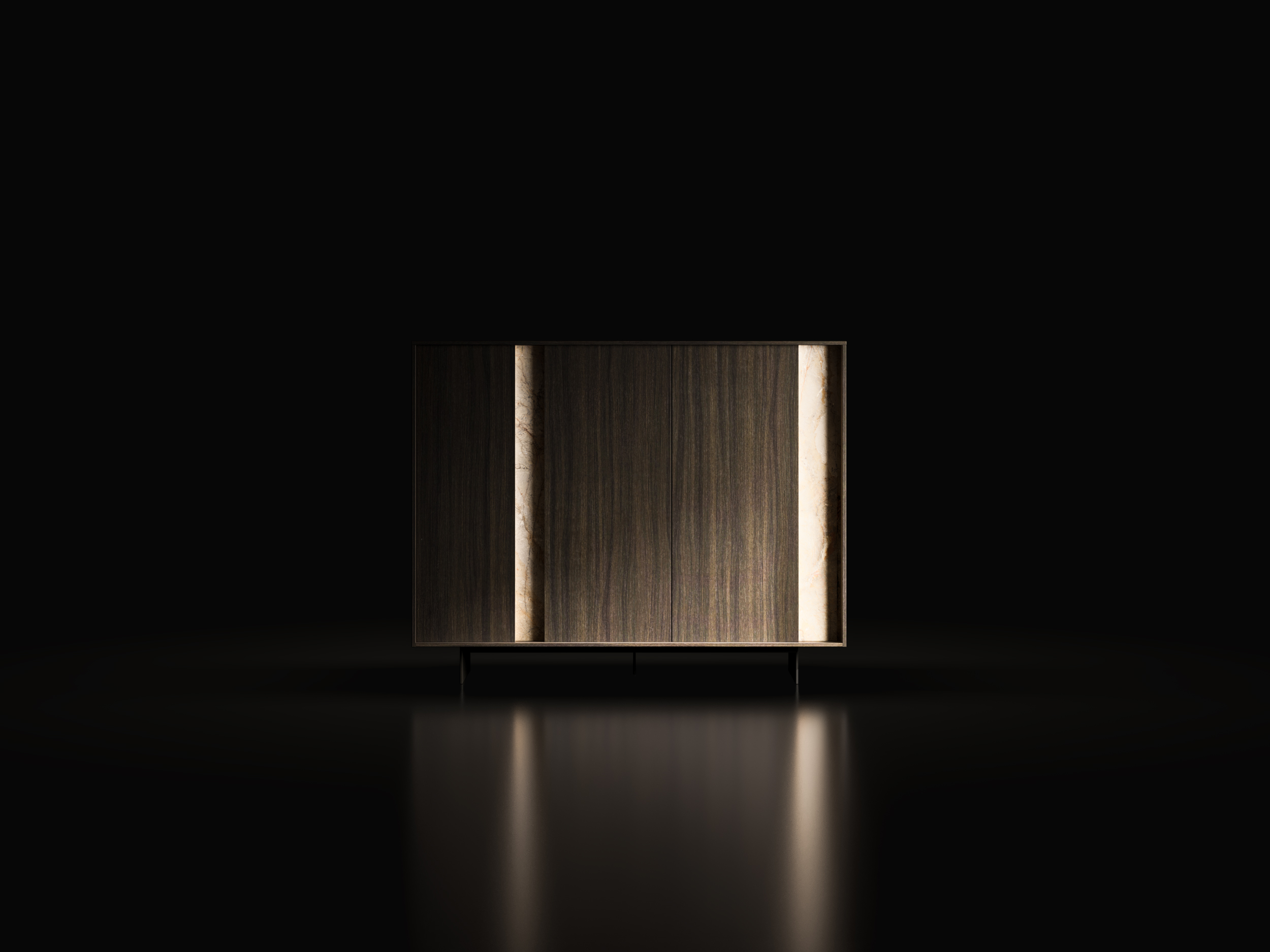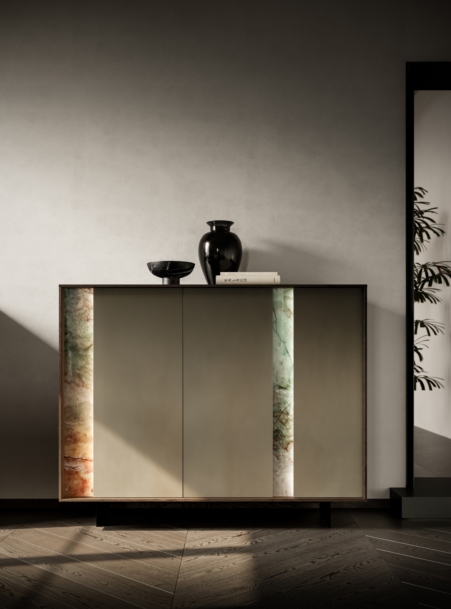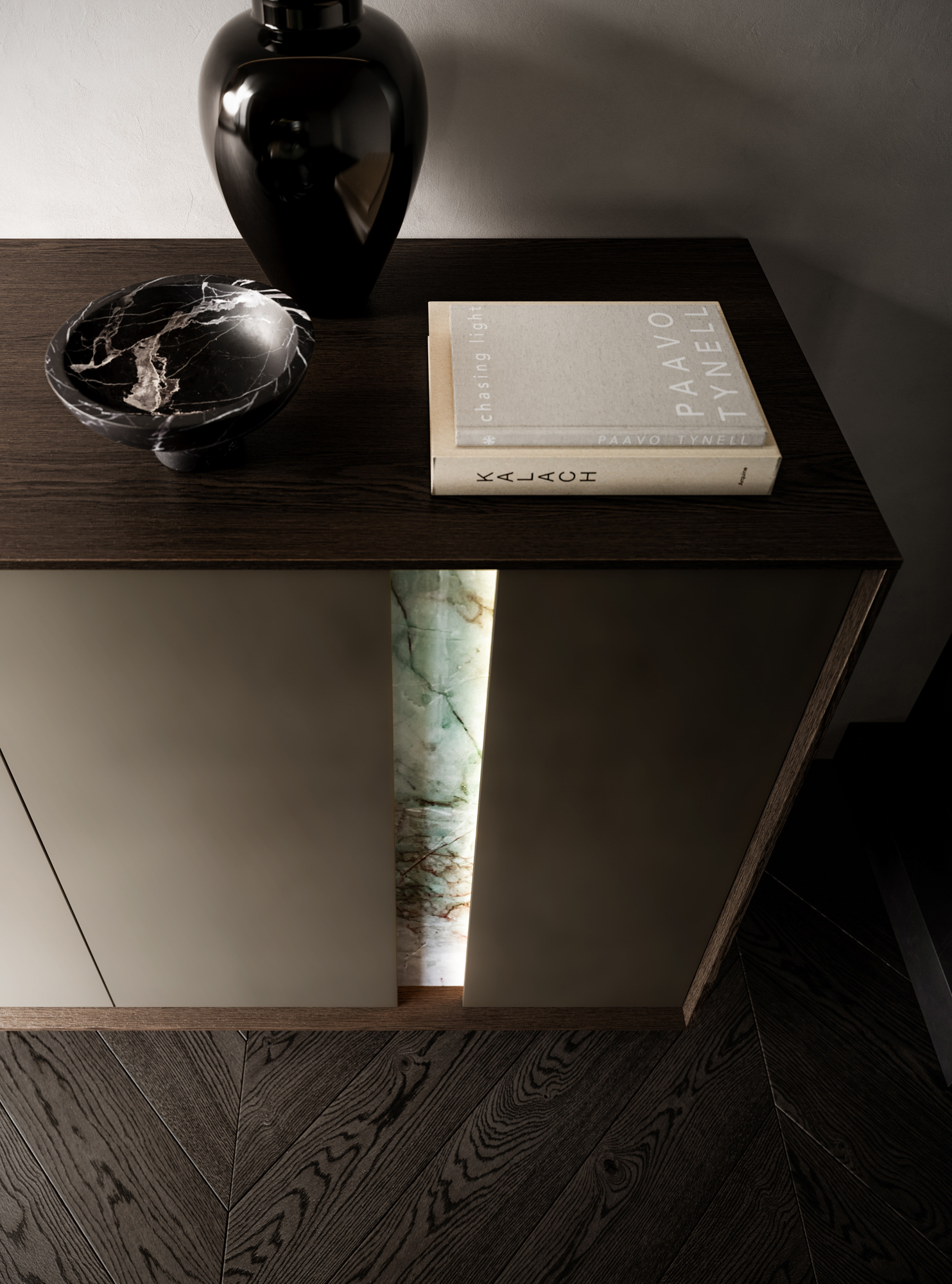 Ritroviamo nella madia il programma Vertical, espresso dagli elementi verticali illuminati in quarzite Aqua Light che fungono da presa maniglia. L’alternanza dei volumi è esaltata dalla combinazione di metallo e pietra.