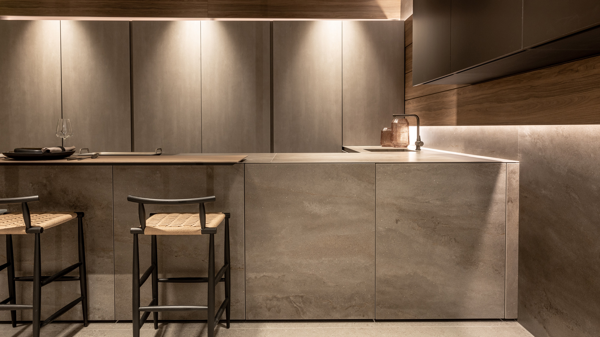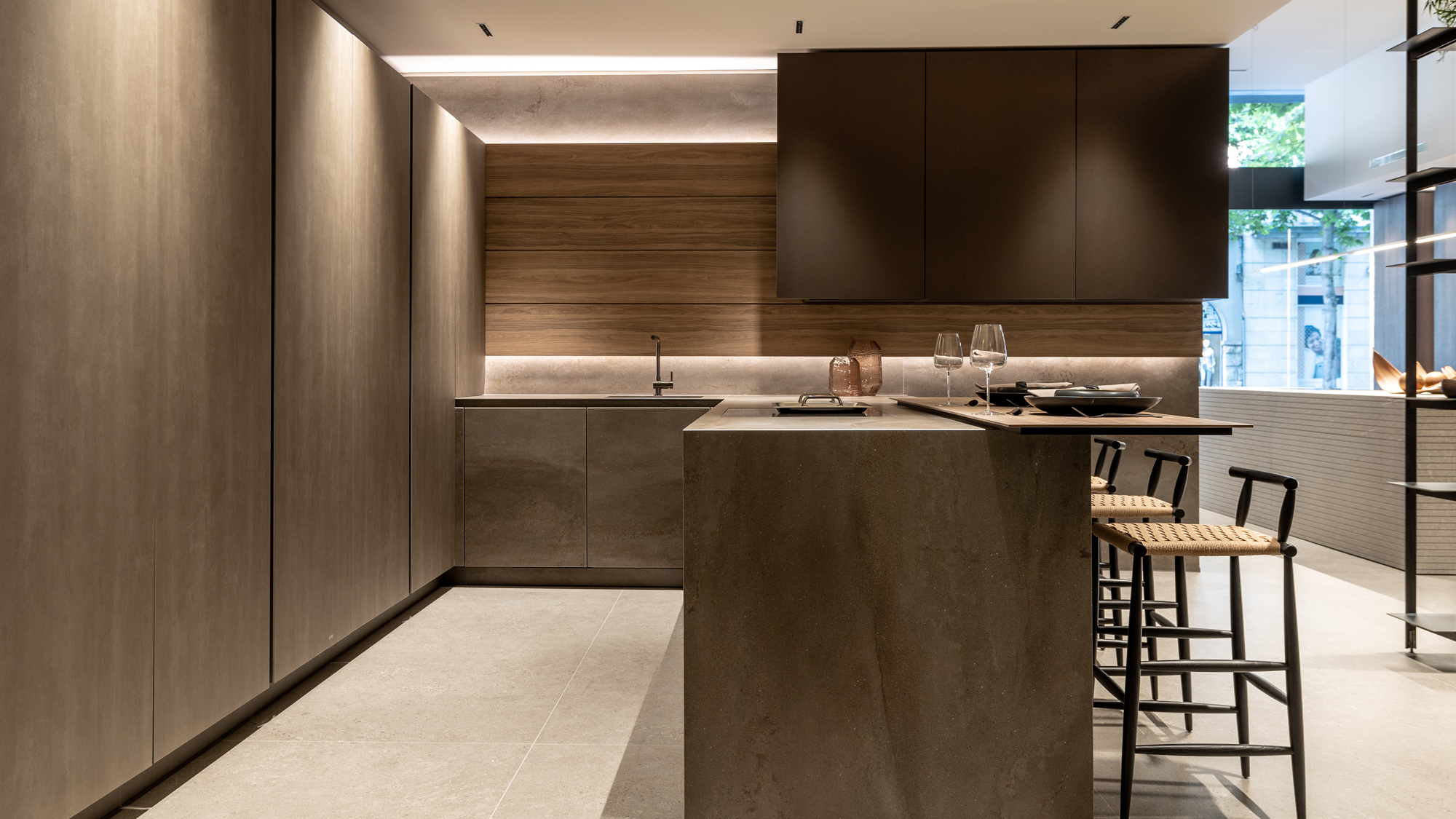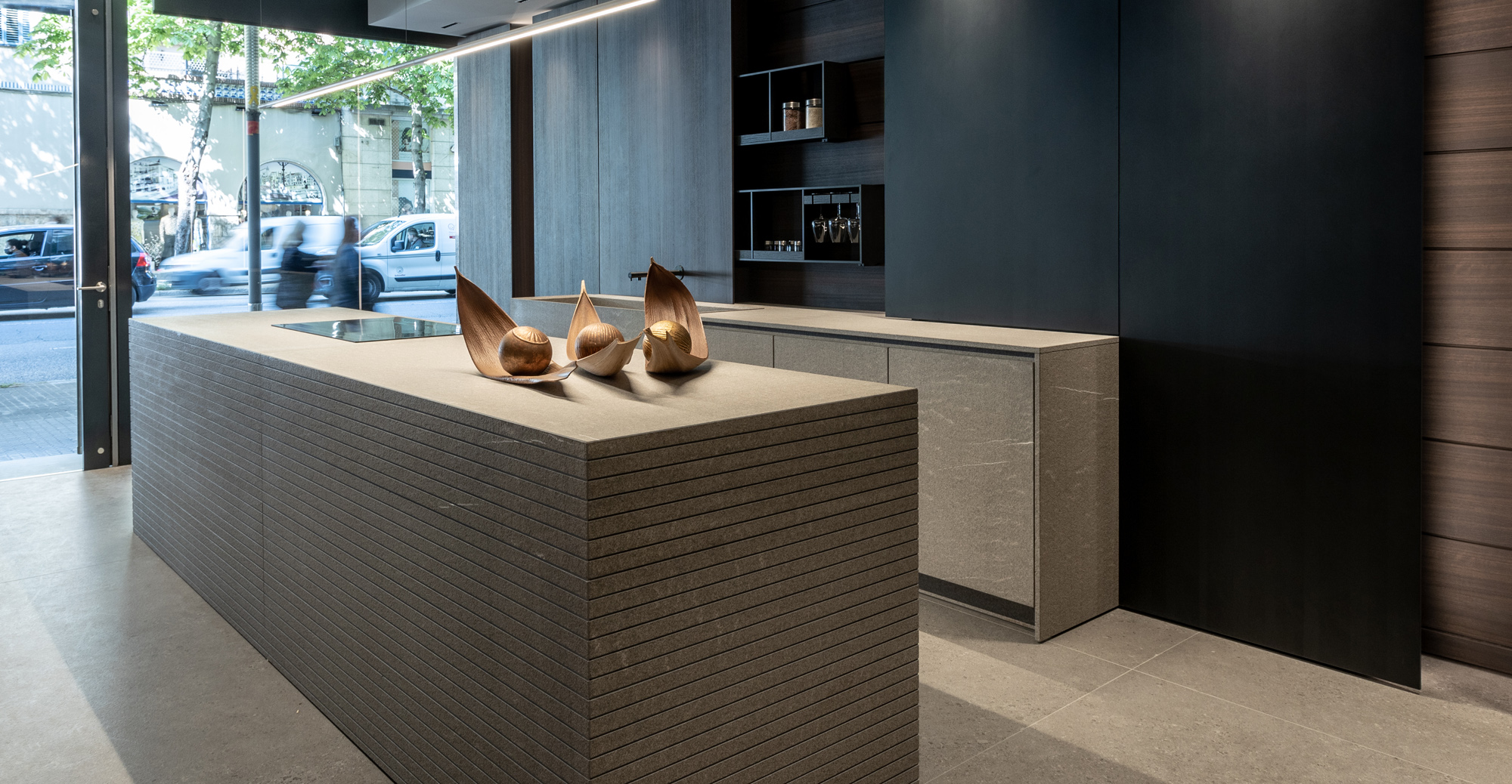 La cucina Blade Lab in Pietra Piasentina e boiserie in Eucalipto interpreta lo spazio come un volume architettonico puro, dove materia e progetto si fondono in un equilibrio essenziale e sofisticato. Il monolite centrale con lavorazione Millerighe esprime la cifra più identitaria del programma Blade Lab: una superficie viva, incisa da una texture verticale che valorizza la profondità della pietra e ne amplifica la dimensione scultorea. La matericità alleggerita da avanzate lavorazioni tecniche, si trasforma in un elemento continuo e monolitico, capace di dialogare con lo spazio circostante con forte impatto visivo ma estrema pulizia formale. L’accostamento con l’impiallacciato in Eucalipto introduce una nota calda e naturale, costruendo un contrasto misurato che rafforza il carattere architettonico della composizione. Il legno, con la sua venatura morbida e raffinata, definisce un ritmo visivo che accompagna la percezione del volume e ne sottolinea la continuità progettuale.