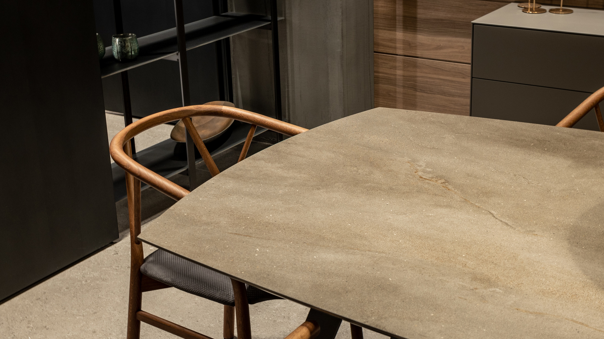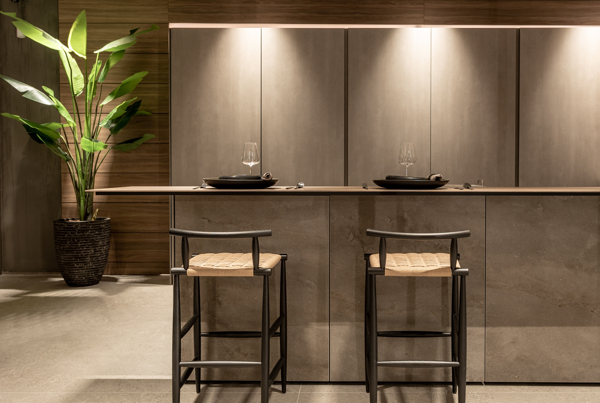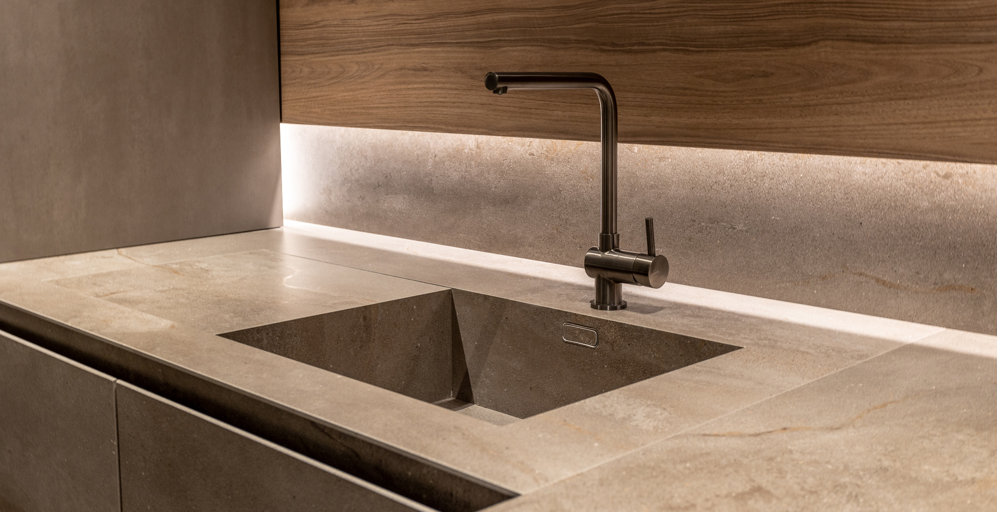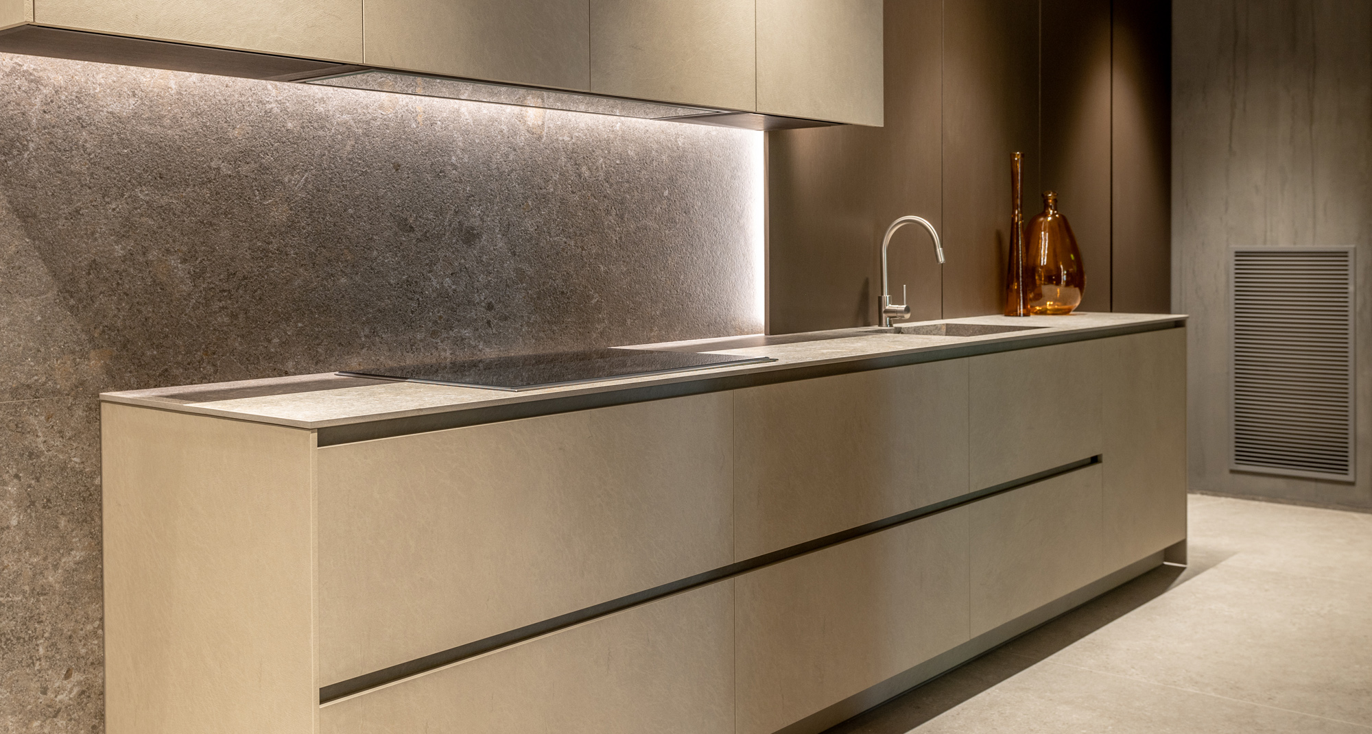 La cucina Blade Lab in Pietra Piasentina e boiserie in Eucalipto interpreta lo spazio come un volume architettonico puro, dove materia e progetto si fondono in un equilibrio essenziale e sofisticato. Il monolite centrale con lavorazione Millerighe esprime la cifra più identitaria del programma Blade Lab: una superficie viva, incisa da una texture verticale che valorizza la profondità della pietra e ne amplifica la dimensione scultorea. La matericità alleggerita da avanzate lavorazioni tecniche, si trasforma in un elemento continuo e monolitico, capace di dialogare con lo spazio circostante con forte impatto visivo ma estrema pulizia formale. L’accostamento con l’impiallacciato in Eucalipto introduce una nota calda e naturale, costruendo un contrasto misurato che rafforza il carattere architettonico della composizione. Il legno, con la sua venatura morbida e raffinata, definisce un ritmo visivo che accompagna la percezione del volume e ne sottolinea la continuità progettuale.