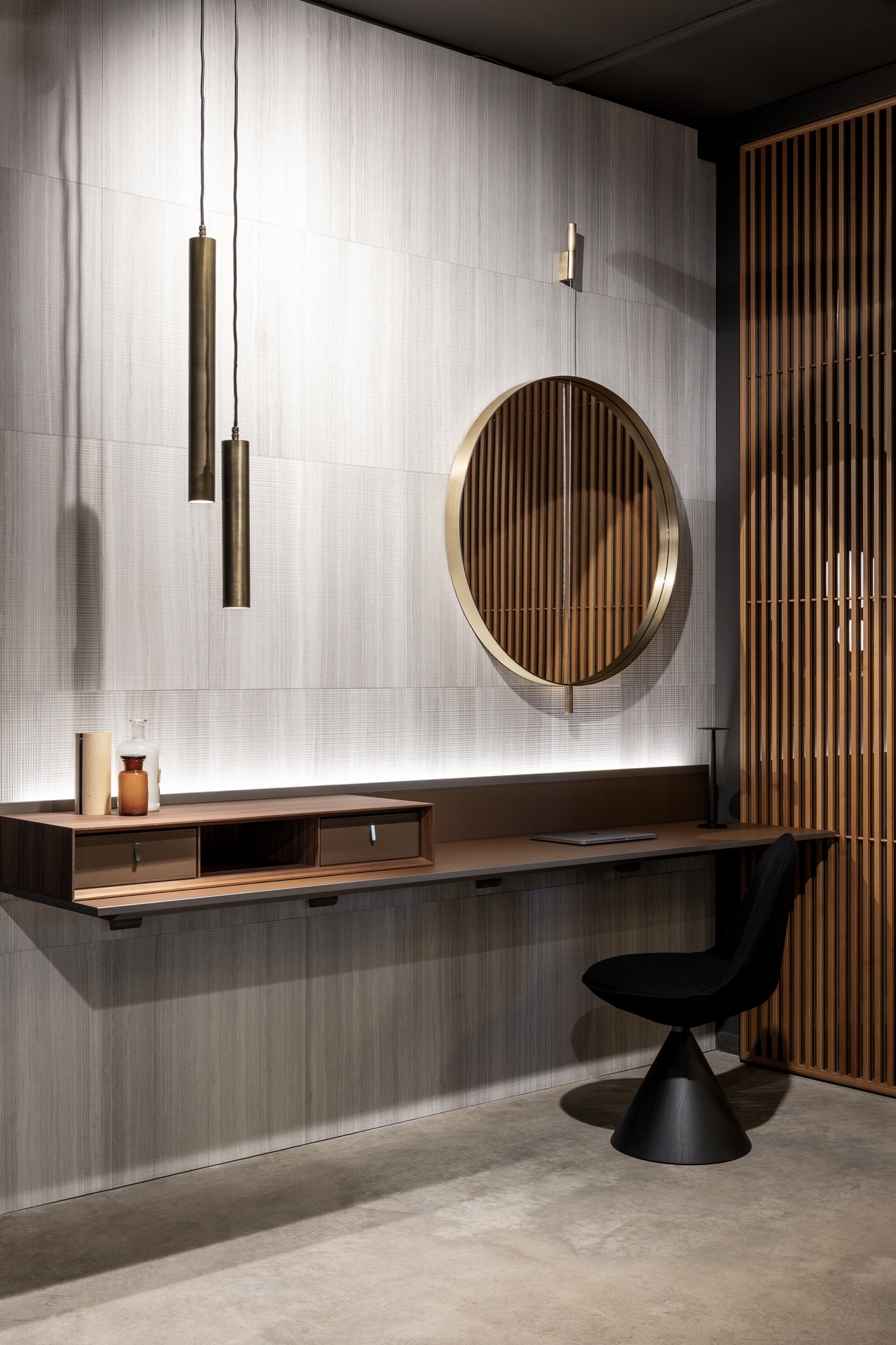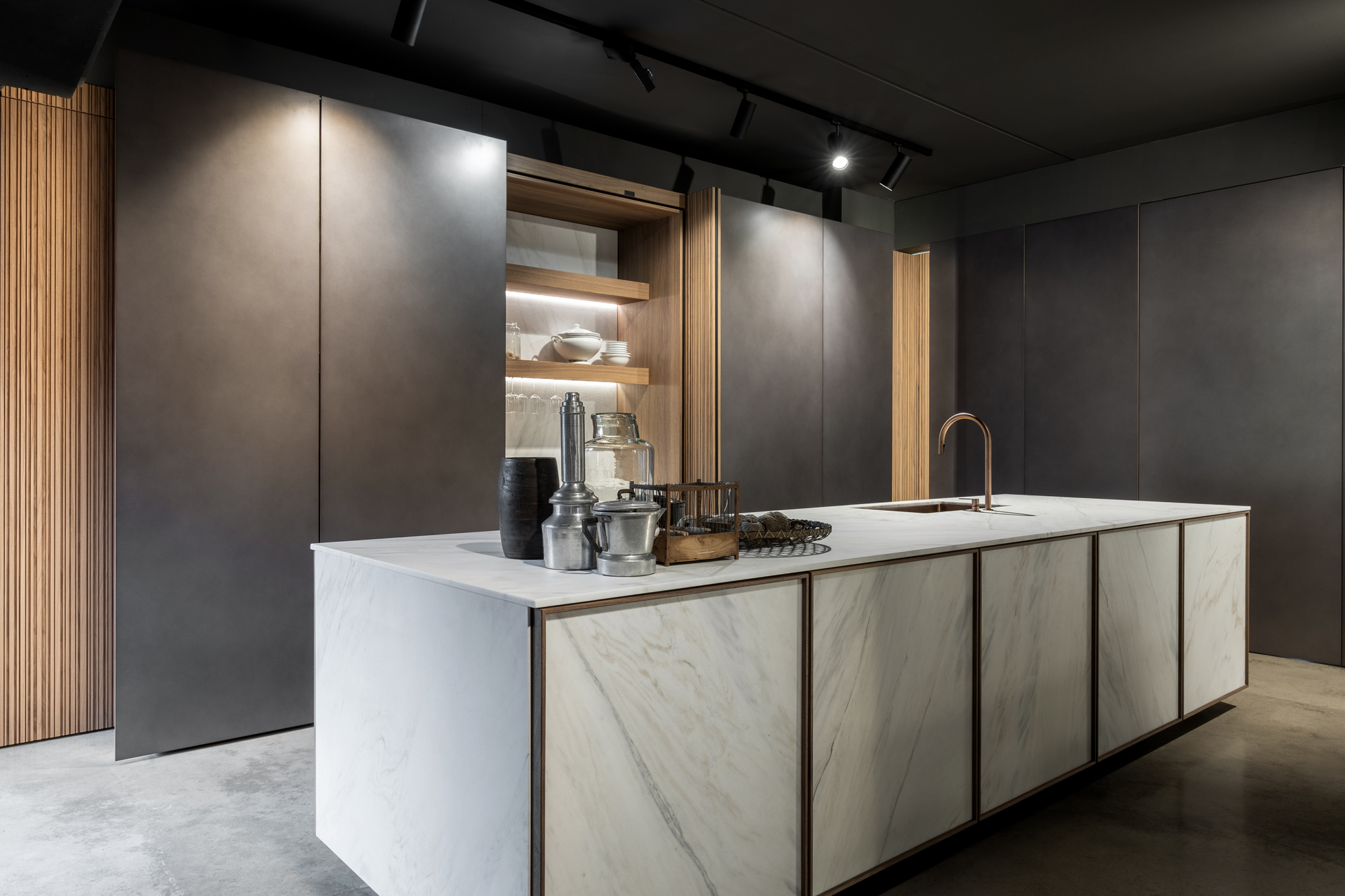 Il know-how di Interior Bauwens si integra con la ricerca Modulnova, dando vita a composizioni in cui la materia diventa elemento narrativo e strutturale. Pietra, legni e superfici tecnologiche si combinano in configurazioni fluide, capaci di adattarsi a contesti internazionali e a esigenze progettuali complesse.