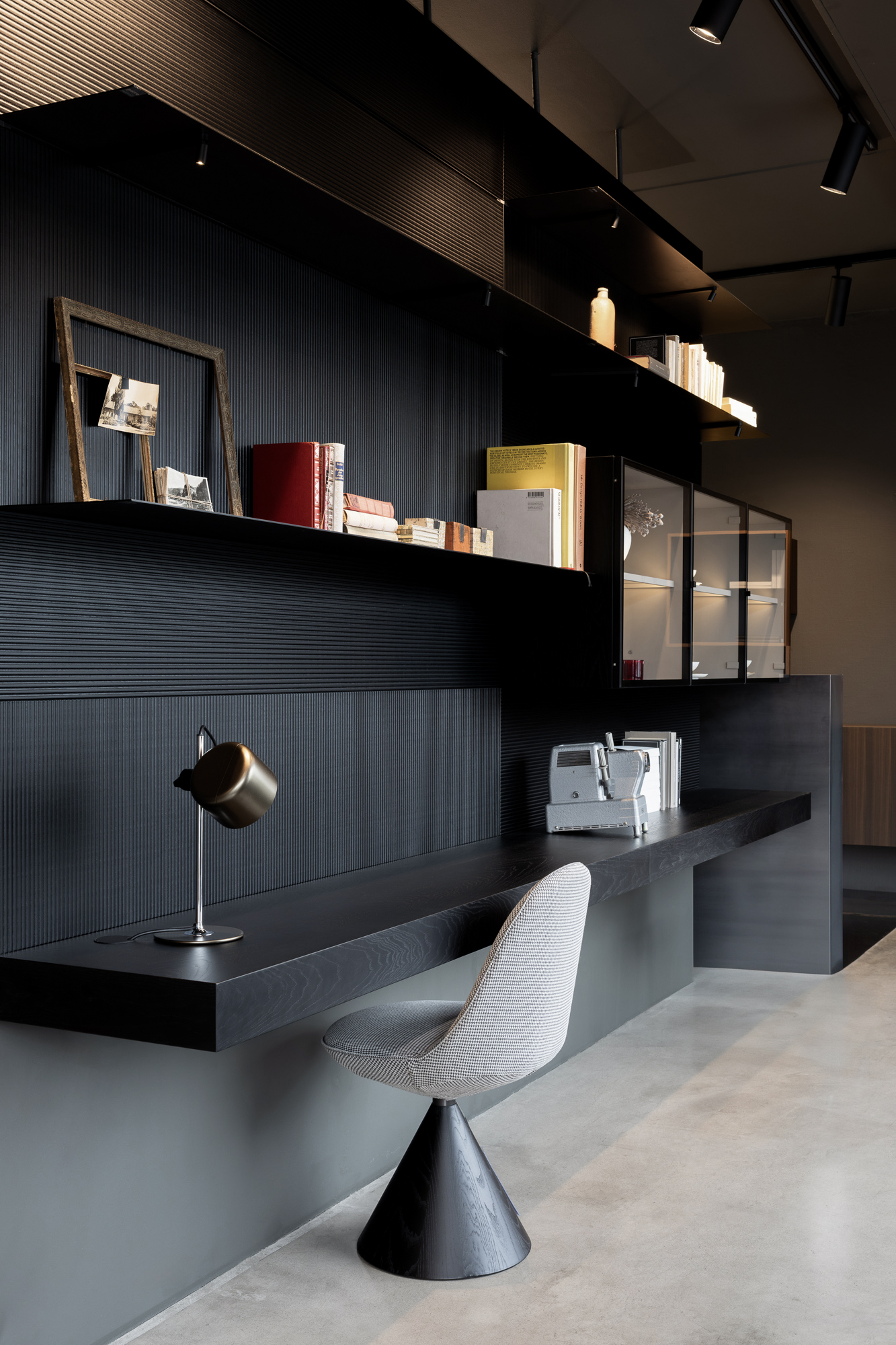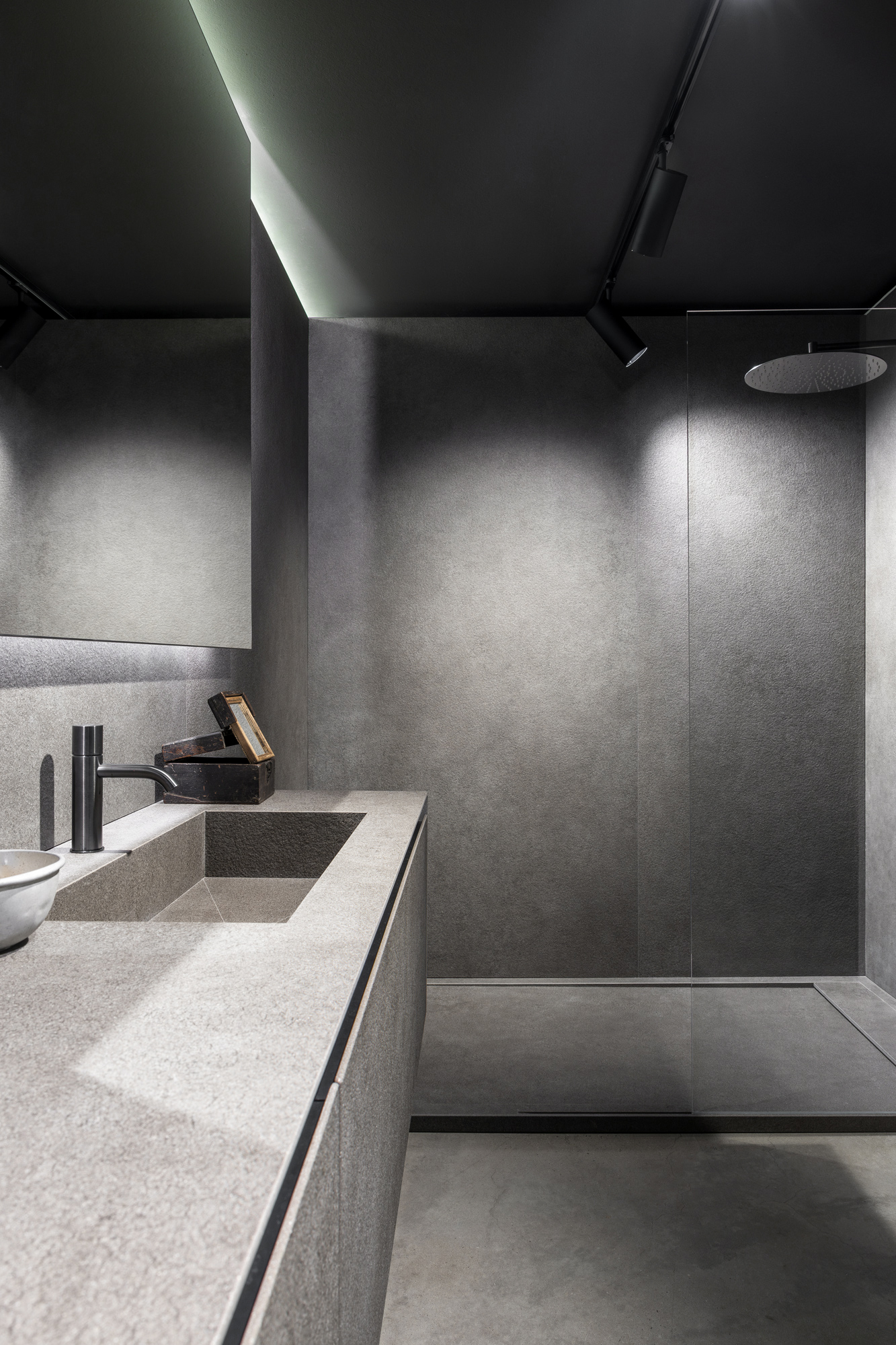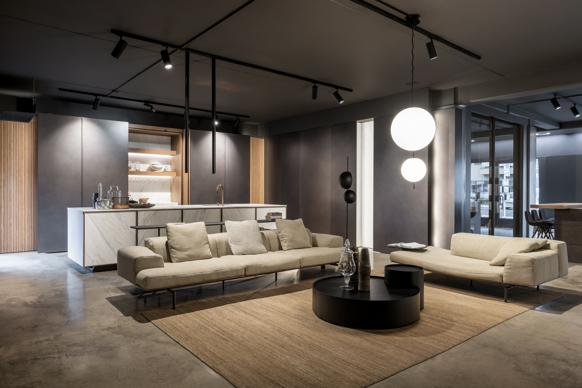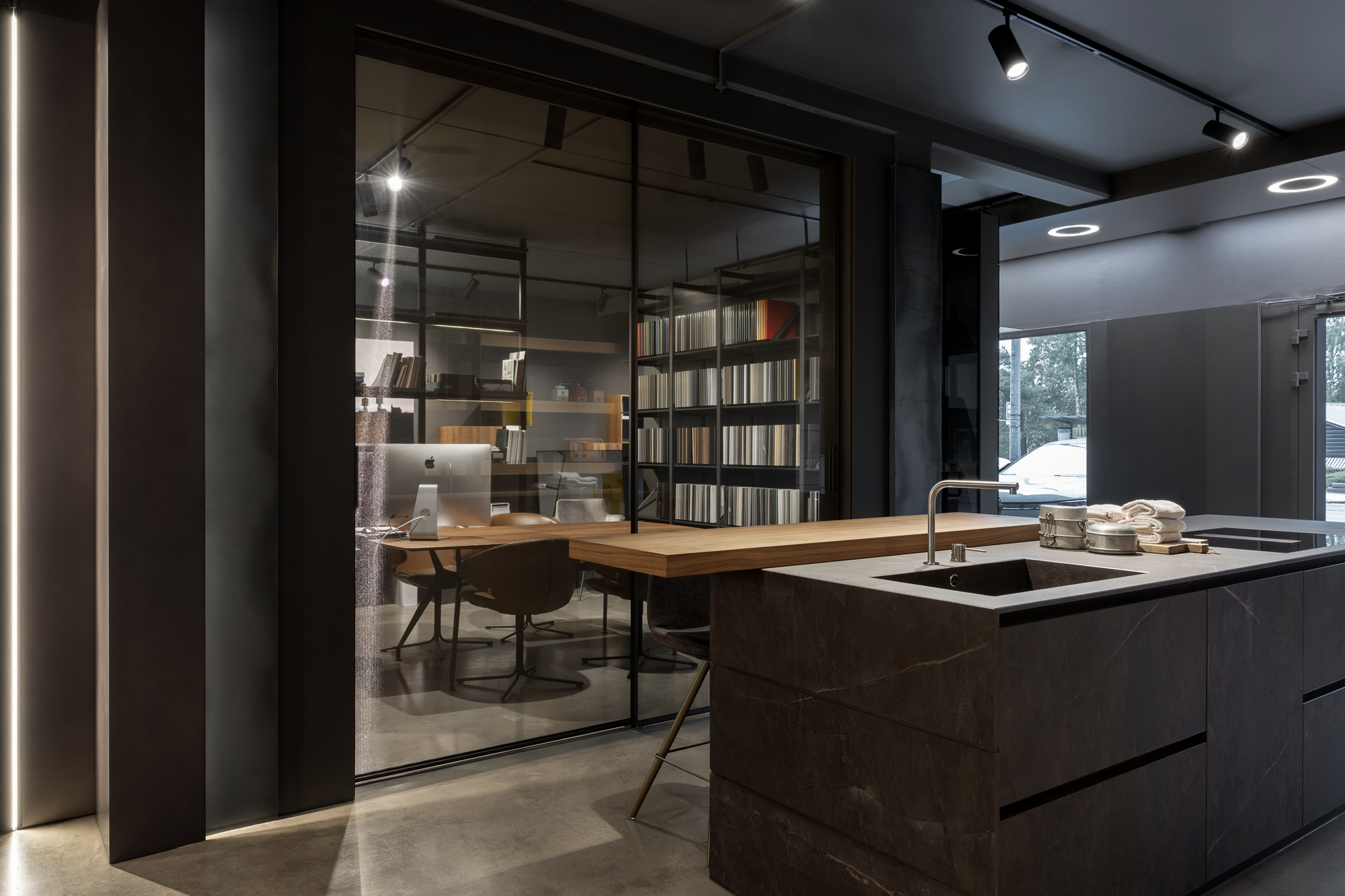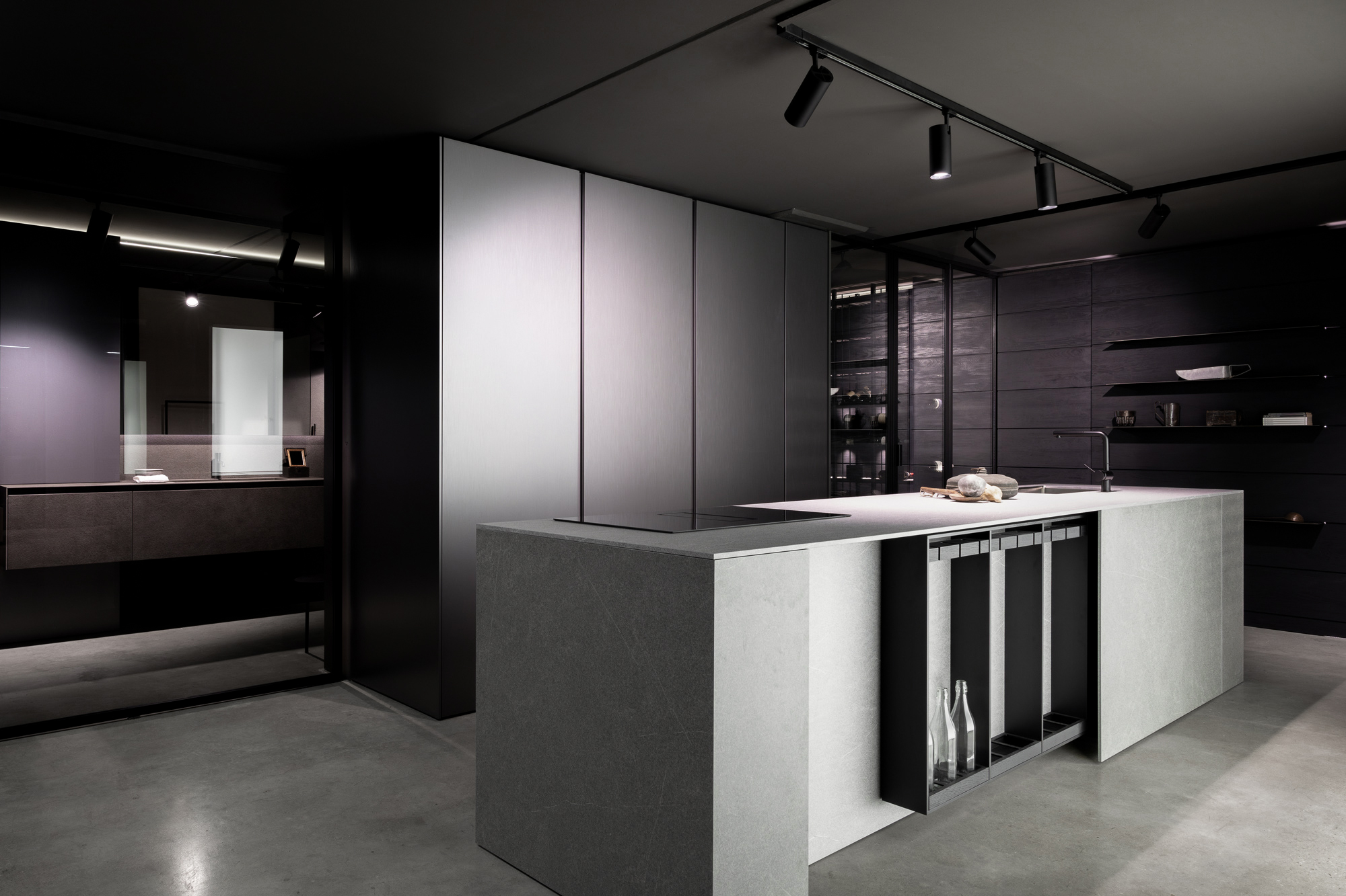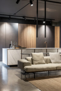 Lo showroom si articola su due livelli e si configura come un ambiente progettuale continuo, in cui cucina, living e bagno dialogano attraverso un linguaggio coerente fatto di volumi puri, materiali ricercati e soluzioni tecniche integrate. L’esperienza dello spazio non è solo espositiva, ma immersiva: ogni ambiente è pensato per essere vissuto come una micro-architettura, in equilibrio tra estetica e uso quotidiano.