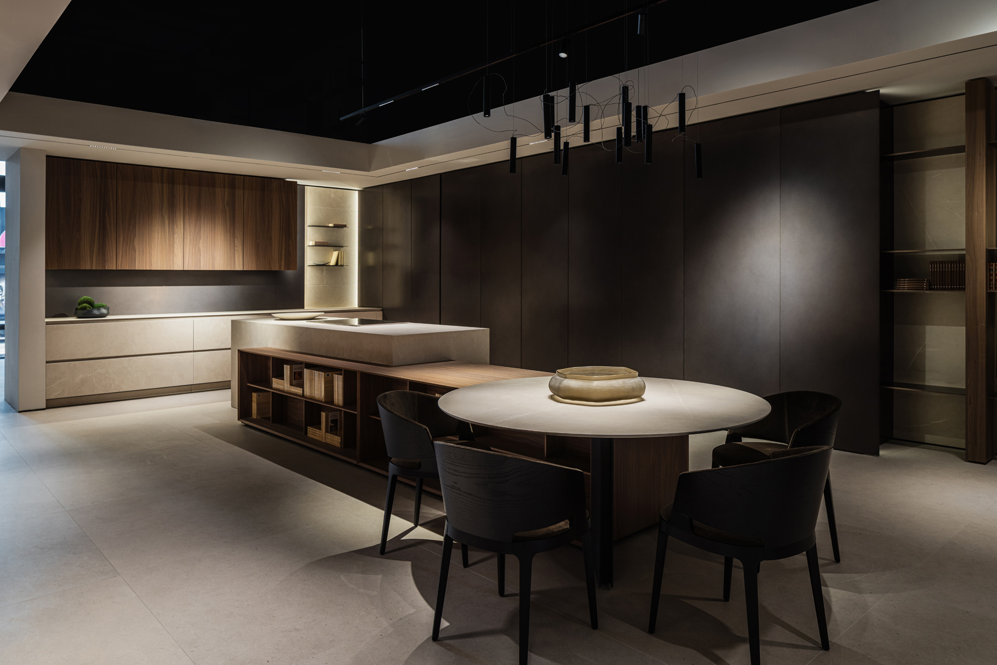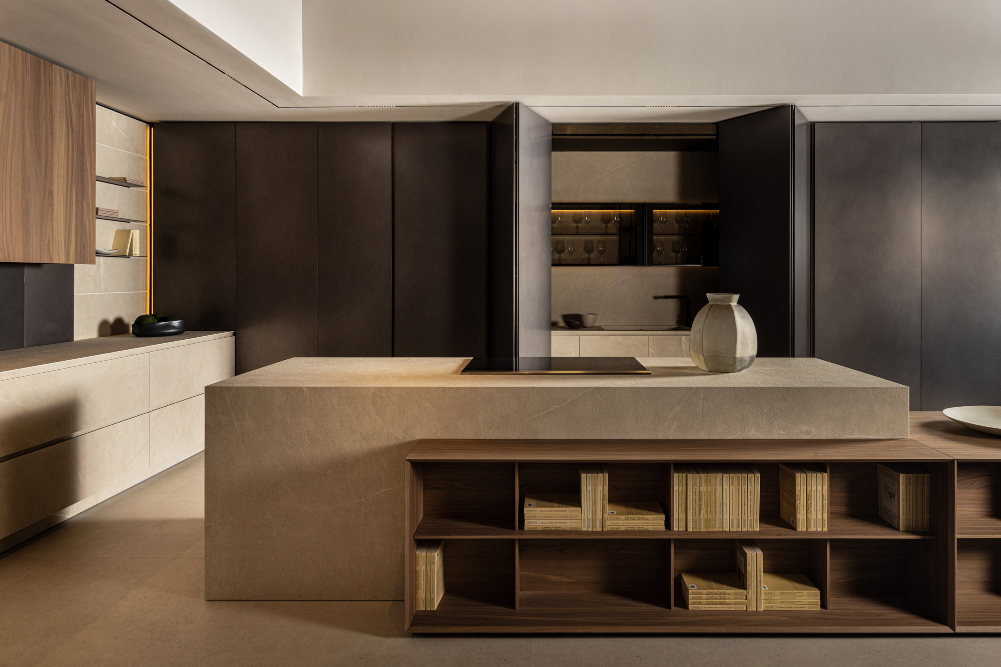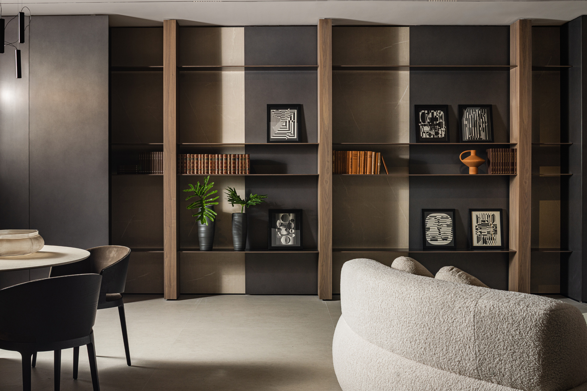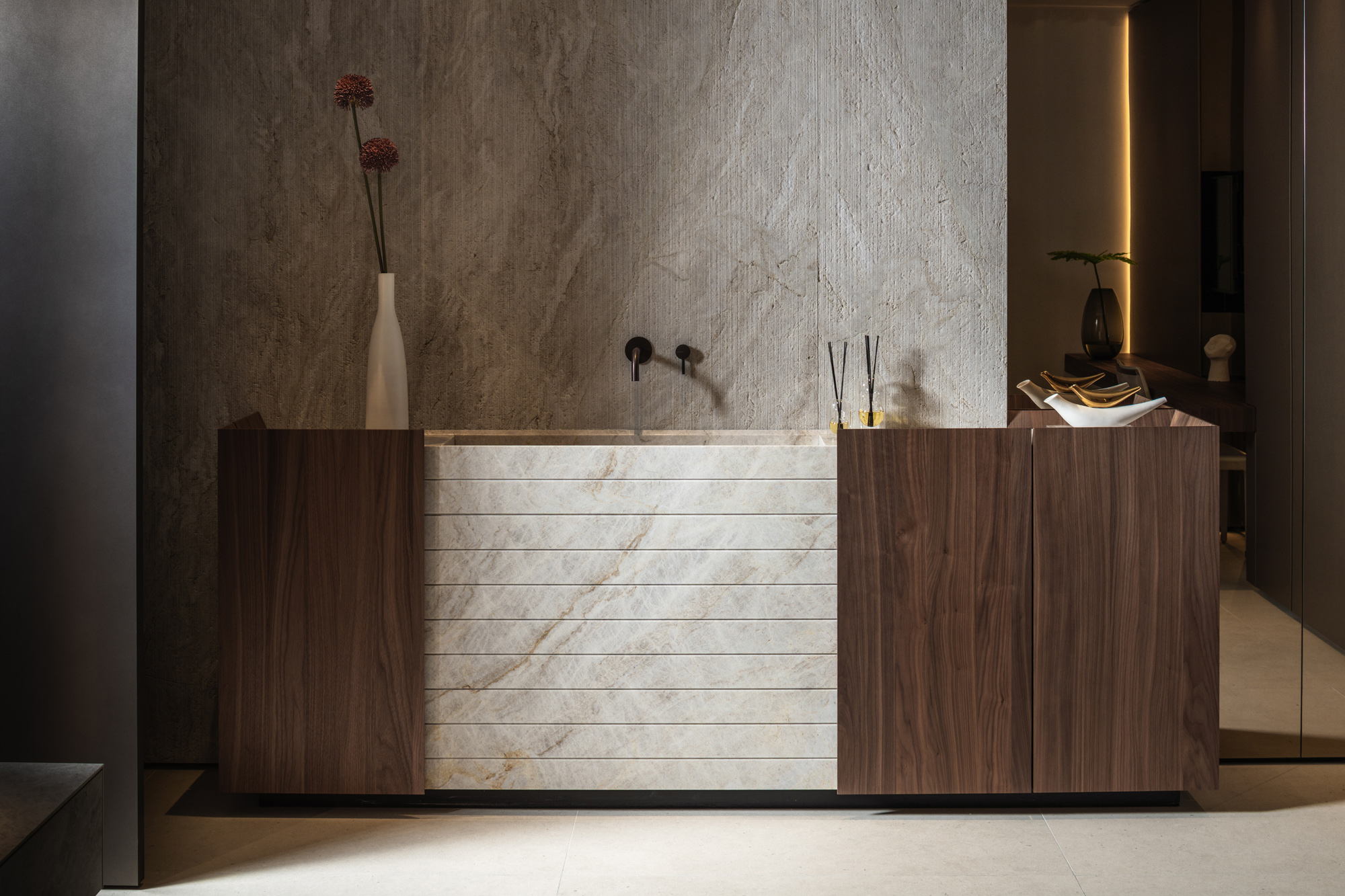 I materiali sono selezionati per le loro qualità estetiche e performative: pietre naturali dalle venature profonde, legni dalle texture autentiche e tattili, laccati opachi che restituiscono superfici continue e minimali, fino a metalli e finiture tecniche che introducono accenti contemporanei e raffinati. La lavorazione accurata esalta la matericità senza comprometterne la pulizia formale, creando un linguaggio coerente e sofisticato.